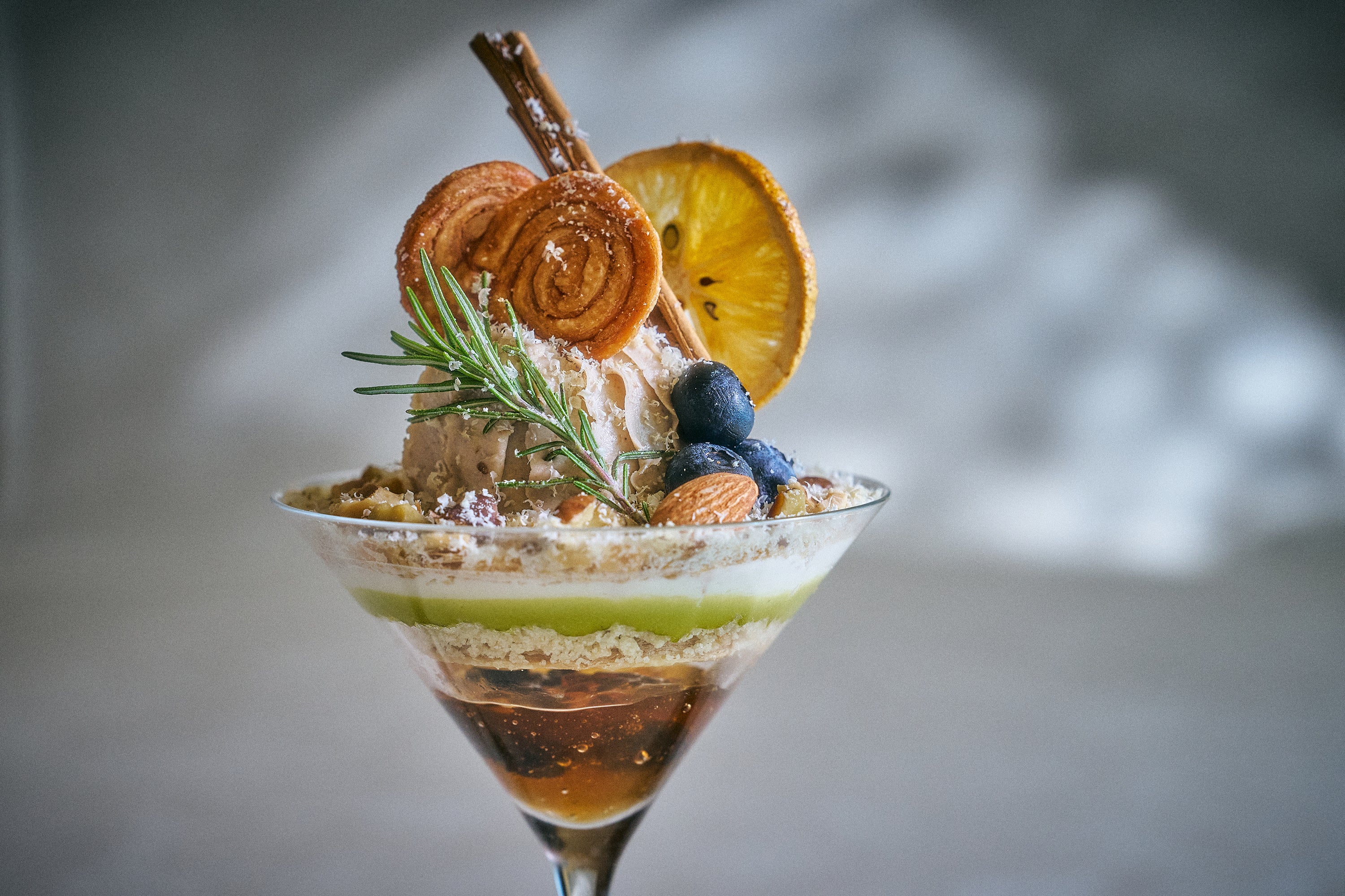 グラスには紅茶のジュレとラムレーズン、米粉のクランブル、豆乳ベースのピスタチオクリームやプラントベースチーズクリームを重ね、食感や味わいに深みをプラスするパイや栗、ナッツを並べました。その上に、アーモンドミルクのアイスを乗せマロンクリームを絞ります。トップには、切り株を思わせるパルミエやブルーベリー、オレンジチップ、シナモンスティックを飾り、植物由来のホワイトチョコレートと栗のパウダーで雪を表現。カシスとメープルシロップのソースで味わいを変えながらお楽しみいただけます。