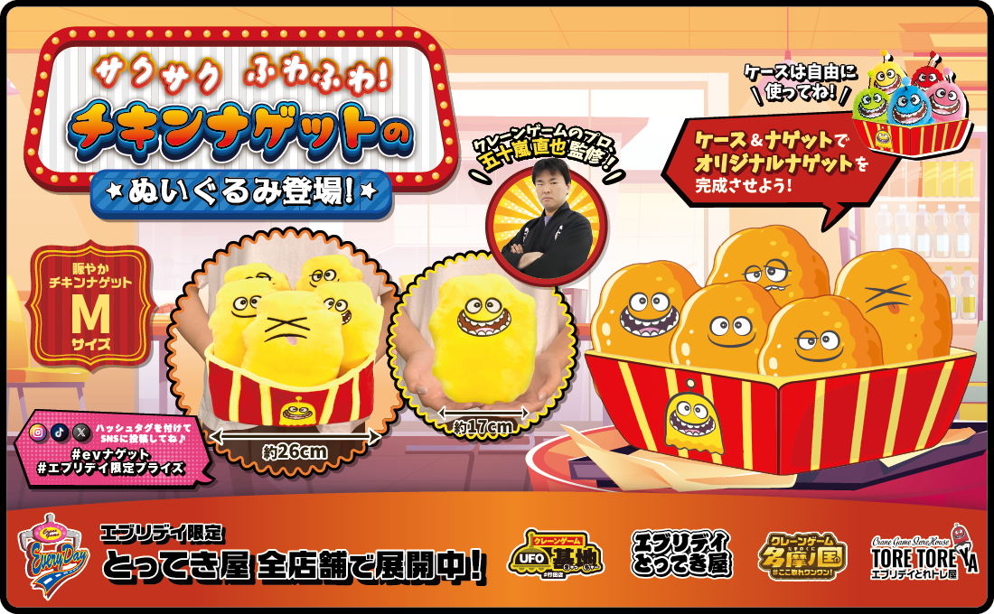 今回登場する新景品は、思わず集めたくなる“サクサク ふわふわ”のチキンナゲットぬいぐるみシリーズです。クレーンゲームのプロ・五十嵐直也氏監修のもと、エブリデイとれトレ屋桶川店のマスコットキャラクター「トレ」の顔が刺繍されており、ユニークな表情や丸みのあるフォルムにこだわり、見た目の可愛さと収納ケースとしての利便性を両立しました。