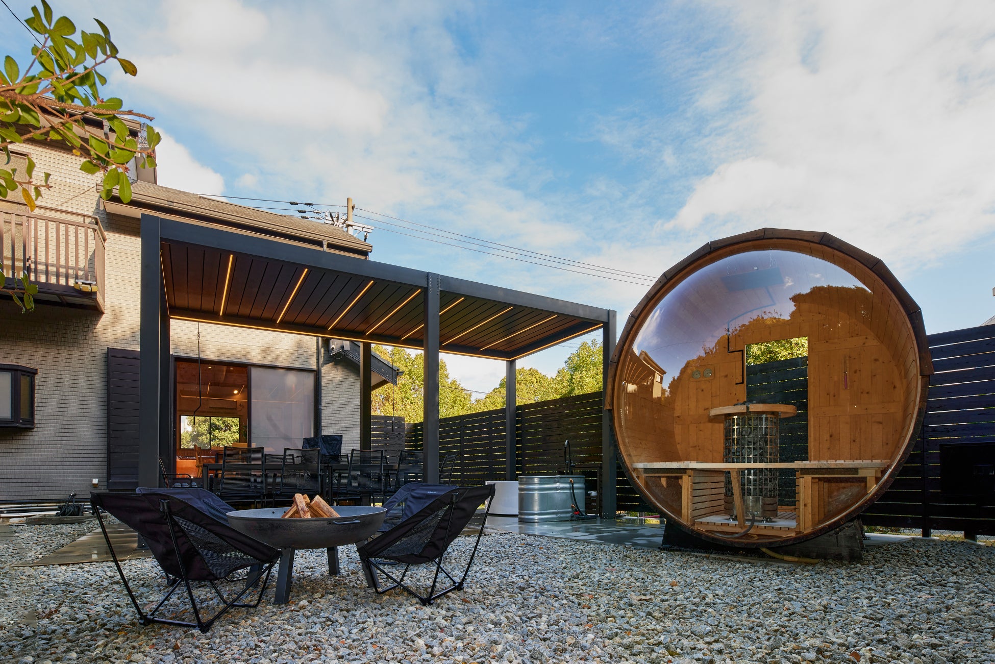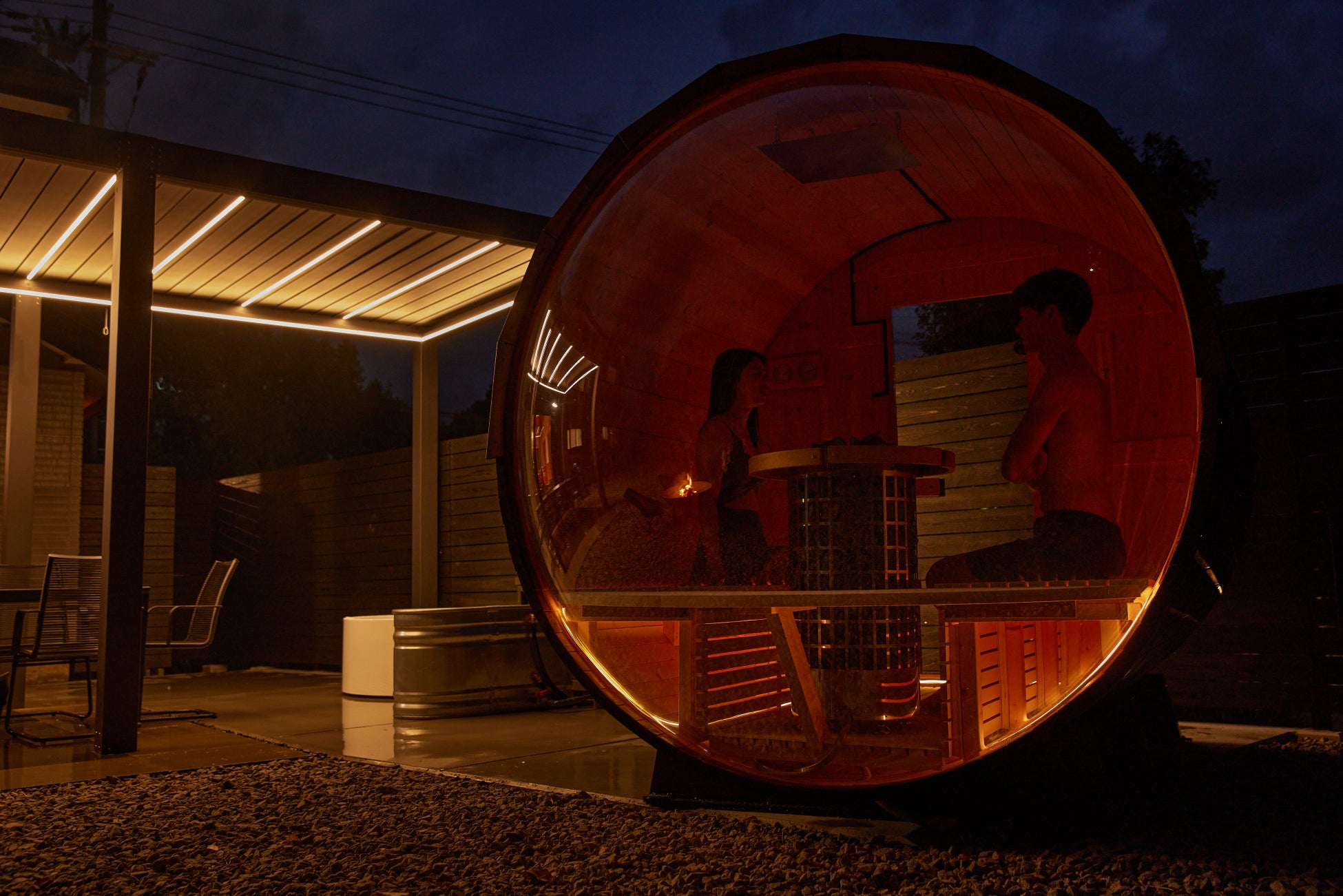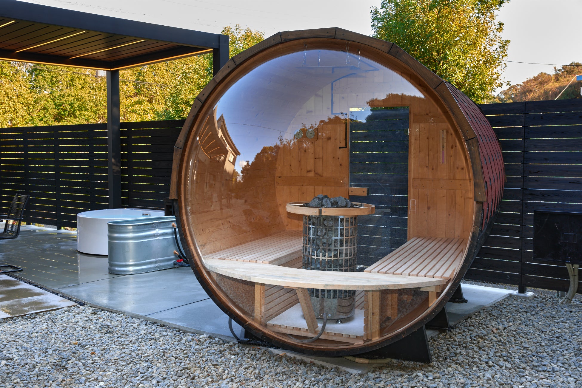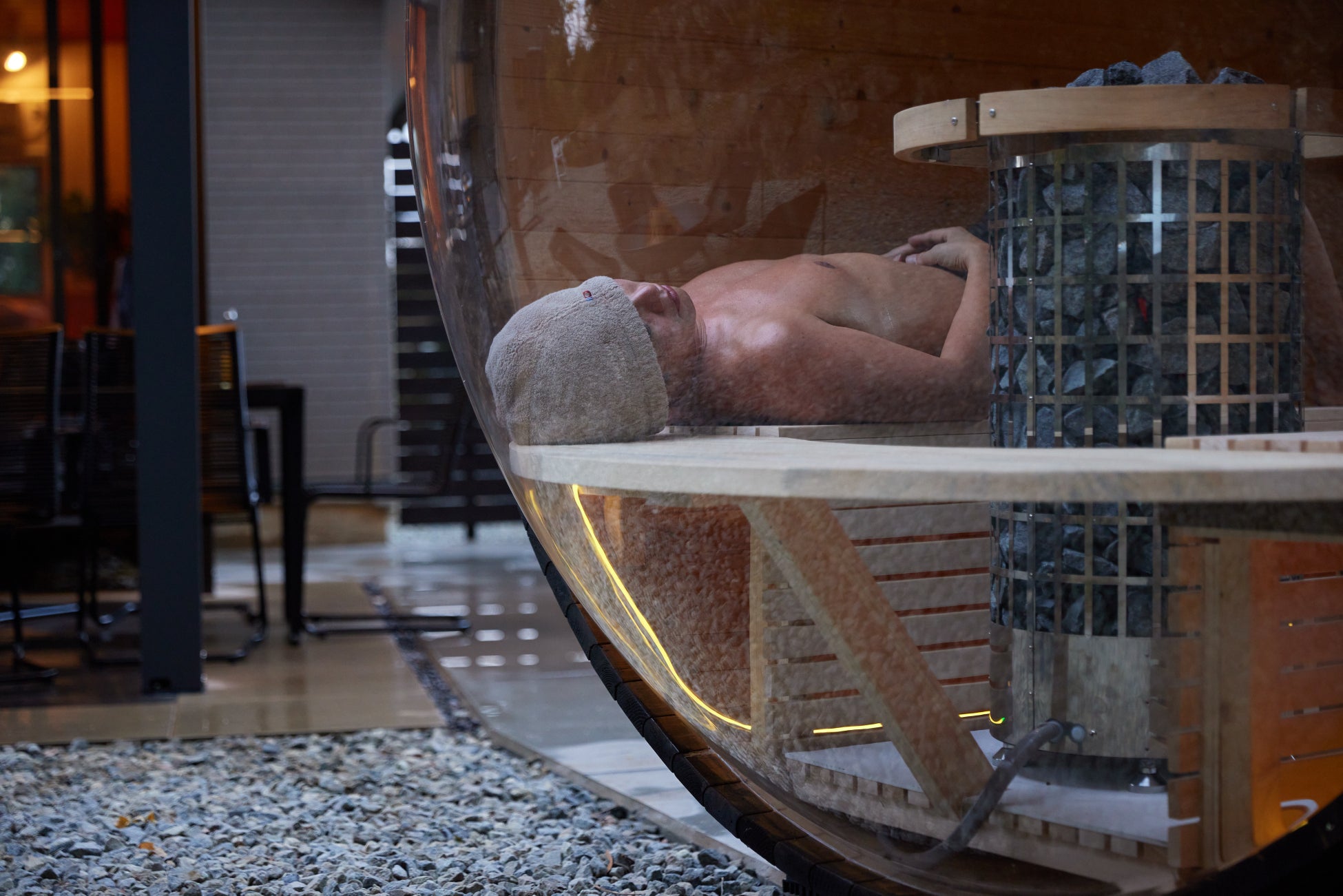 円形のフォルムが特徴のバレルサウナ内は、大人がゆったりと横になれるほどの広さを確保しており、心身を解きほぐすための余白が感じられる空間です。正面には大きなドーム型の窓を設え、外の景色を眺めながら、開放感とともにじっくりと身体を温めることができます。