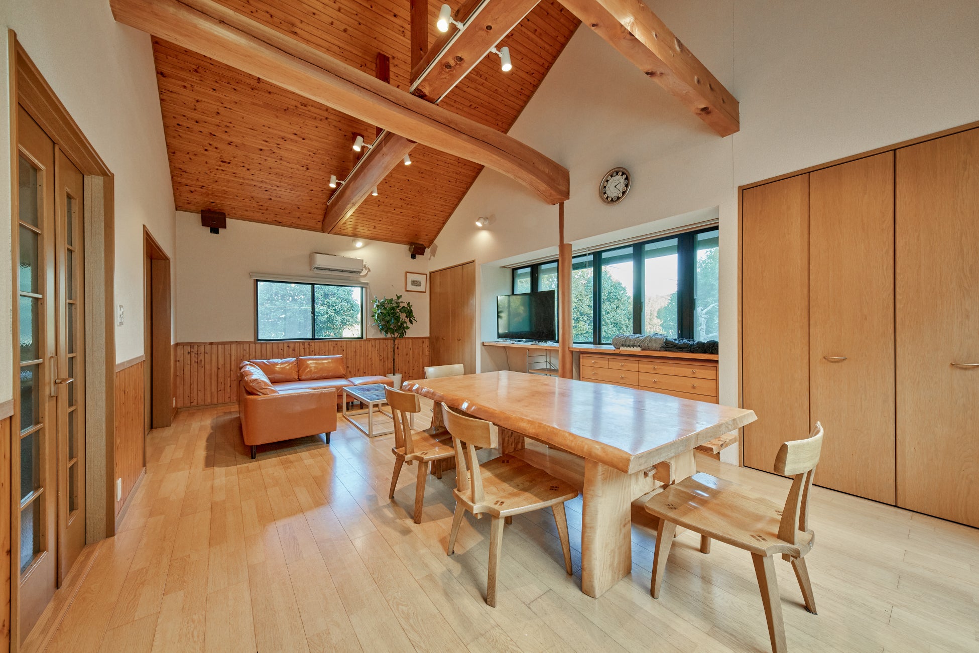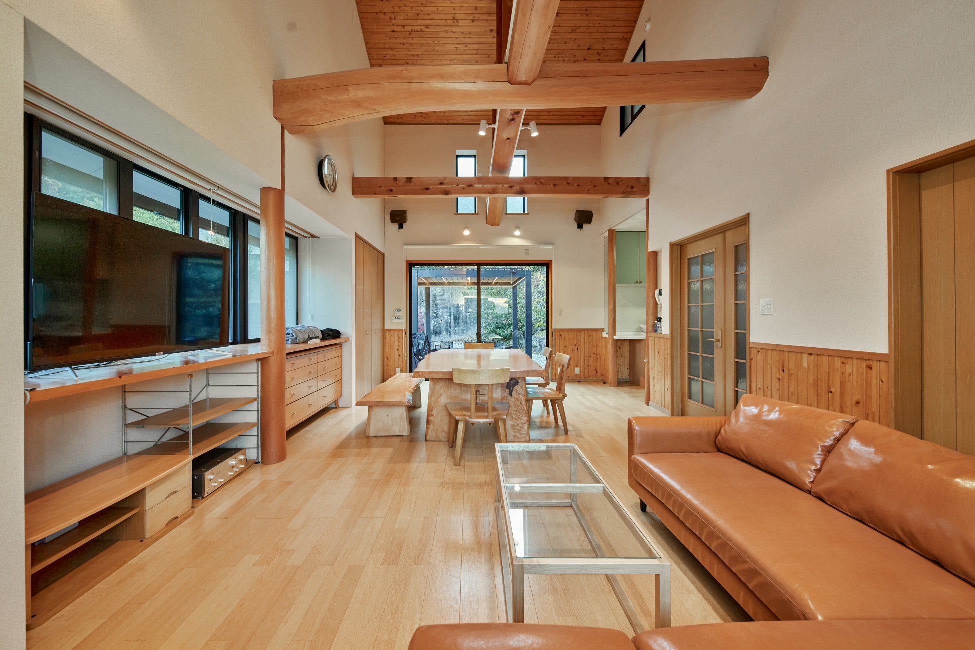 また、ゆったりとしたソファを備え、大人数で集まっても窮屈さを感じにくく、家族や仲間と自然体でくつろげる心地よさが魅力です。吹き抜けならではの縦の広がりと柔らかな光が、滞在時間をより快適なものにしてくれます。