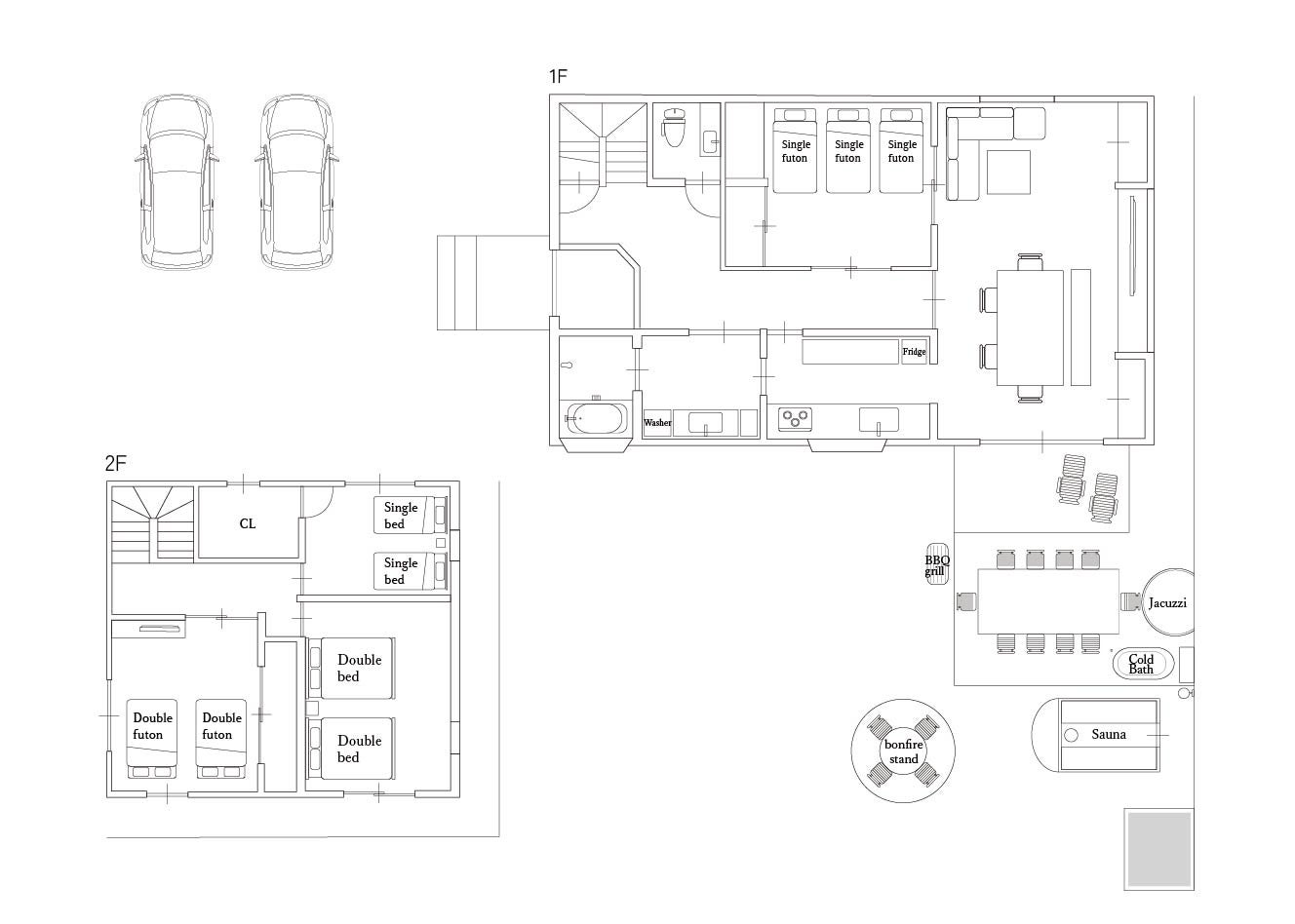 2階にはプライベートが保たれたベッドルームを3室ご用意。ダブルベッド2台を備えた寝室が2室、シングルベッド2台の寝室が1室あり、1階の和室と合わせて最大14名様まで快適に宿泊いただけます。グループやファミリーでの滞在でも互いに気兼ねせず、深い眠りに就ける設計です。
