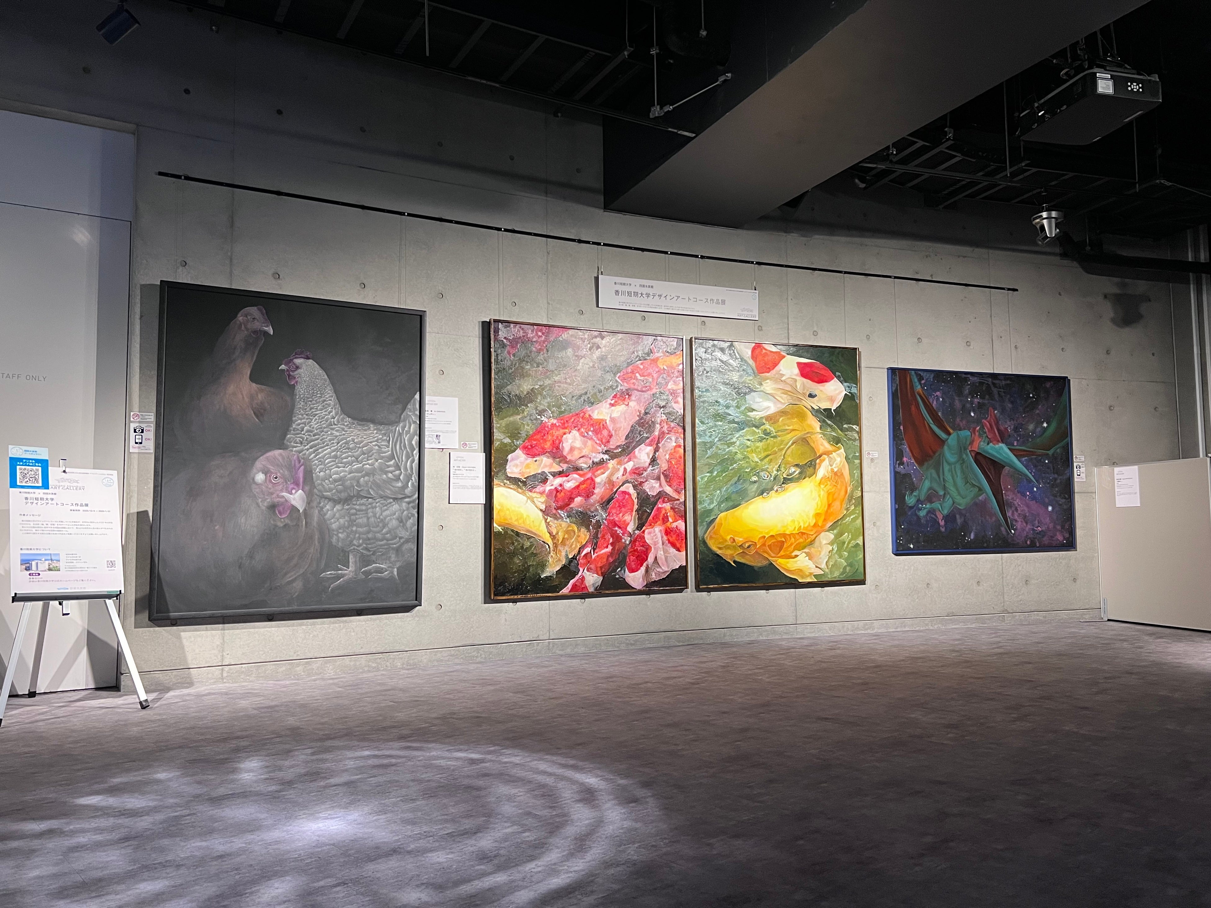 香川短期大学との包括連携協定に基づき開催する本展では、香川短期大学デザインアートコースに所属していた卒業生が、在学中に制作したF100号(縦130.3cm、横162.0cmの長方形のキャンバス)の作品のなかから、生きもの(鶏、鯉、恐竜)をモチーフとした作品4点を、海豚ホールに展示しています。