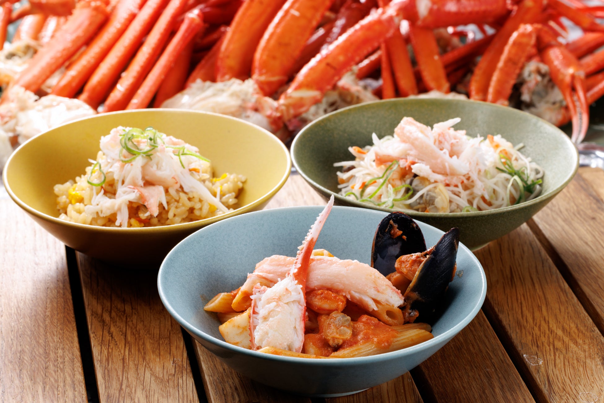 当プラン販売期間中は、夕食でベニズワイガニを食べ放題で堪能できます。またベニズワイガニの身をカニロブスタークリームパスタにトッピングするなど、アレンジメニューにトライするのも、ビュッフェならではの楽しみ方です。そして一日の締めくくりには、大山の景色を望む最上階のラウンジで、地酒の熱燗や温かいドリンクを楽しみ、翌日のスノーアクティビティへ向けて心身ともに整うオールインクルーシブステイを提供します。