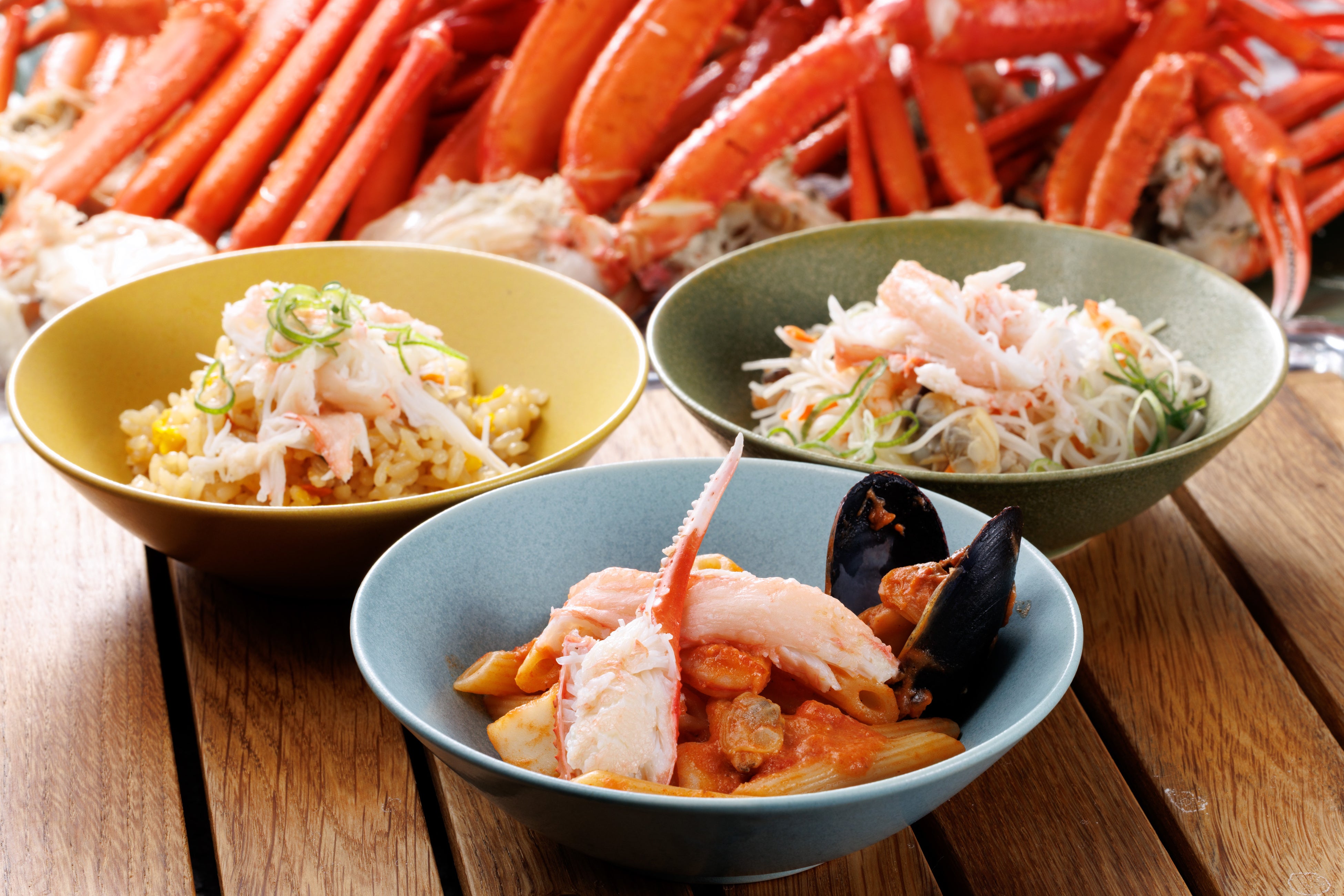 当プラン販売期間中は、夕食でベニズワイガニを食べ放題で堪能できます。またベニズワイガニの身をカニロブスタークリームパスタにトッピングするなど、アレンジメニューにトライするのも、ビュッフェならではの楽しみ方です。そして一日の締めくくりには、大山の景色を望む最上階のラウンジで、地酒の熱燗や温かいドリンクを楽しみ、翌日のスノーアクティビティへ向けて心身ともに整うオールインクルーシブステイを提供します。