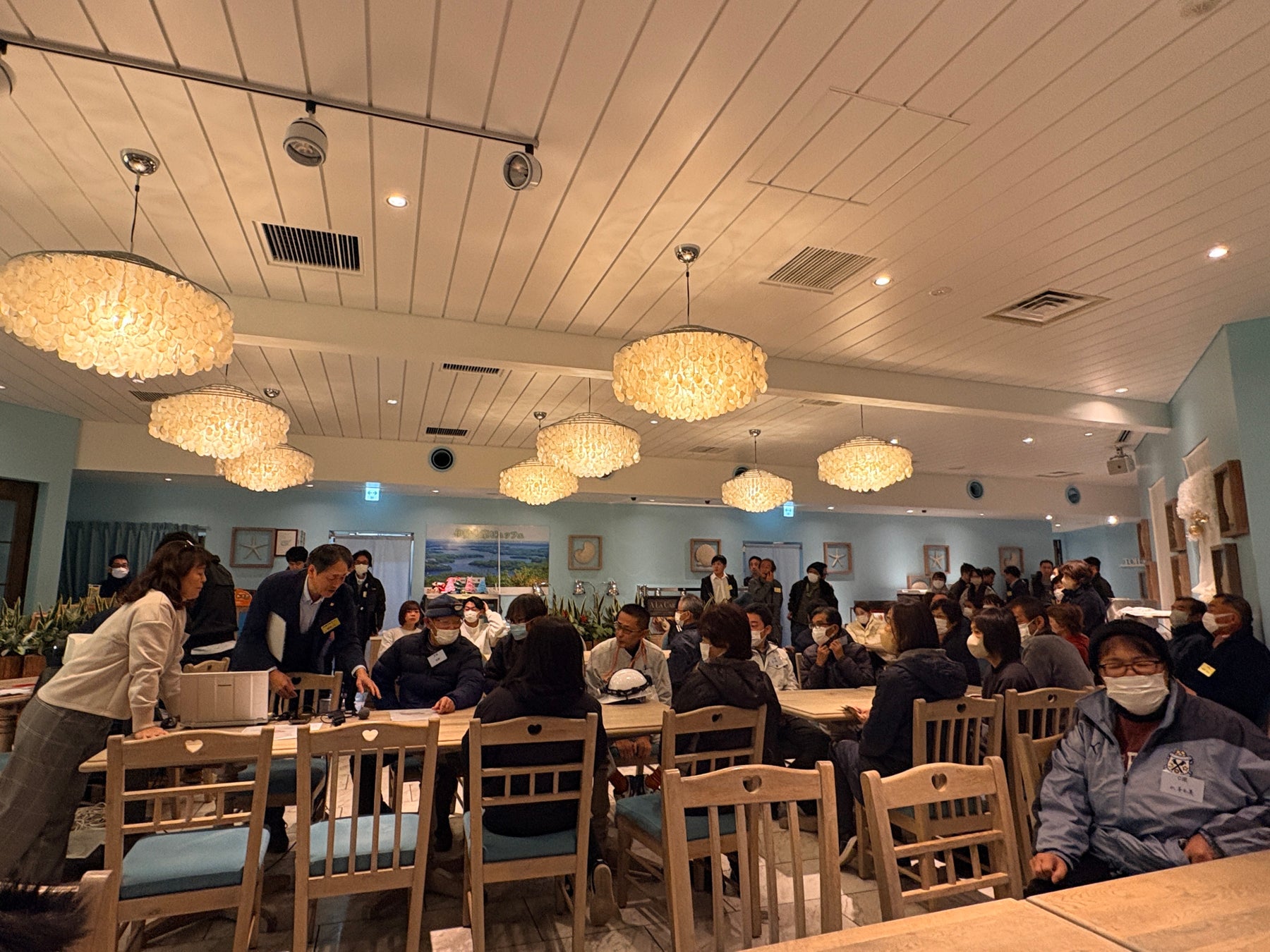 すべての訓練を終了後、参加者はレストラン「アスール」に集合し、おこわと豚汁を試食。その後、班ごとに分かれて意見交換会を行い、現場で感じた課題や改善点が率直に共有されました。