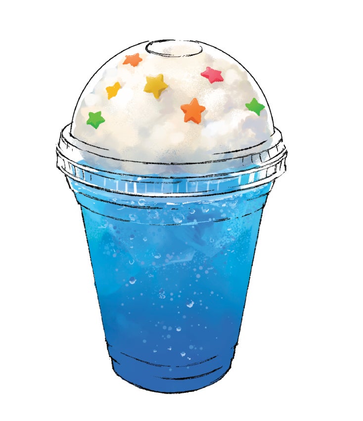 ・ナニカのオーロラソーダ 価格:900円(税込)ブルーキュラソーシロップ/スプライト/炭酸⽔/オーロラパウダー⼊りコットンキャンディー/砂糖菓⼦