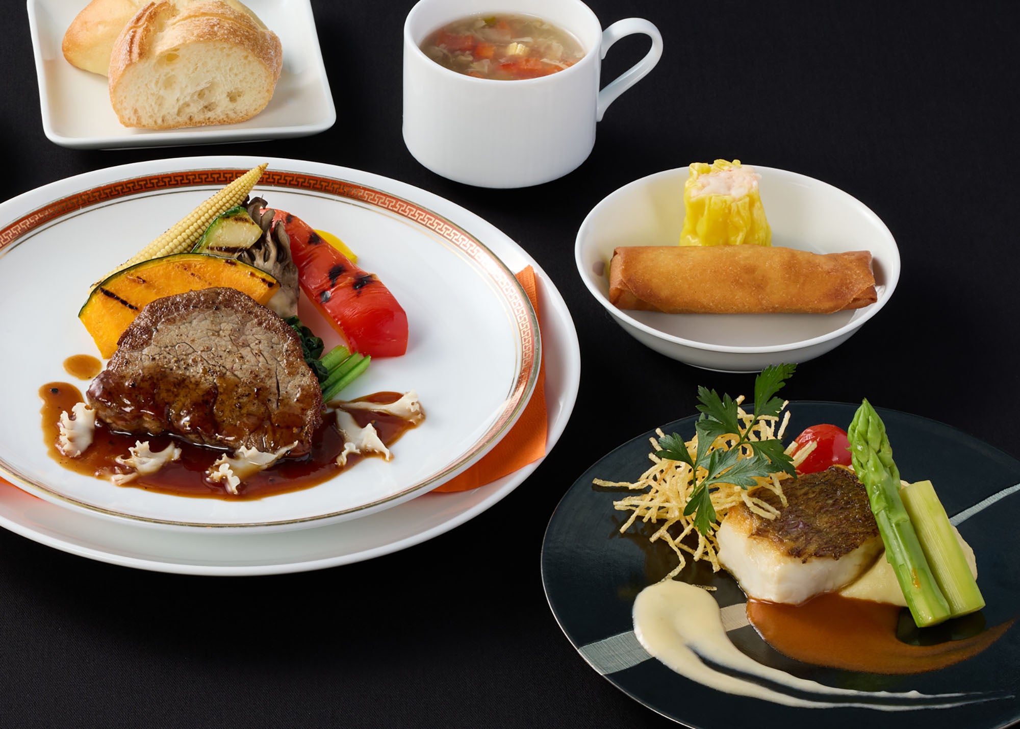 本日の手作り点心2種 / 真鯛のポワレ 彩り2種ソース / 牛フィレ肉のポワレ 中華特製ソース