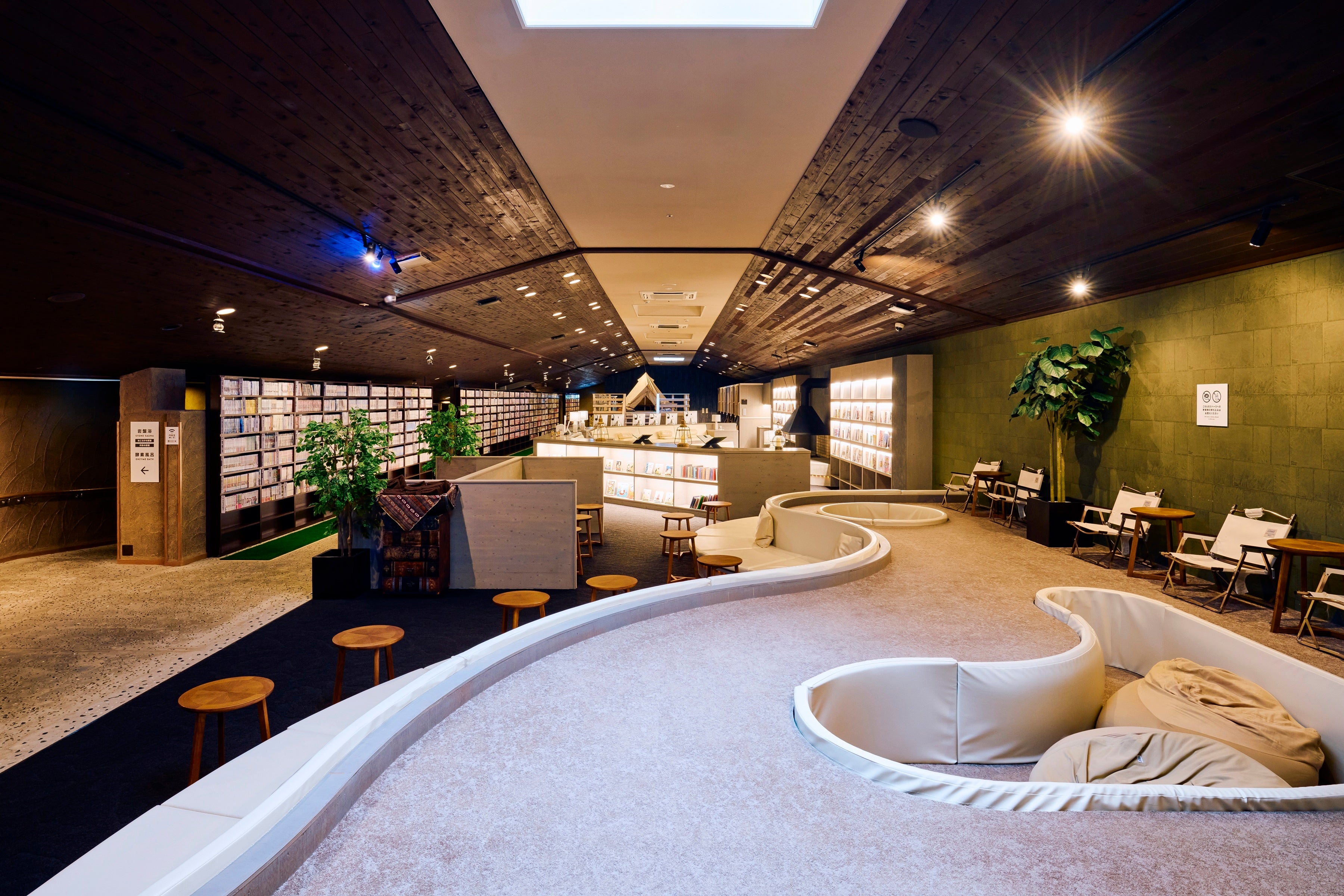 2階は、従来の大広間を全面改装し、「海のねころびラウンジ」を新設。フロア全体が休憩ラウンジとなり、「森」「海」など、それぞれのテーマに沿った空間デザインで統一。柔らかな光と居心地のよいインテリアに包まれ、湯上がりの体をさらにゆったりと休める、没入感のあるリラックス空間を提供します。