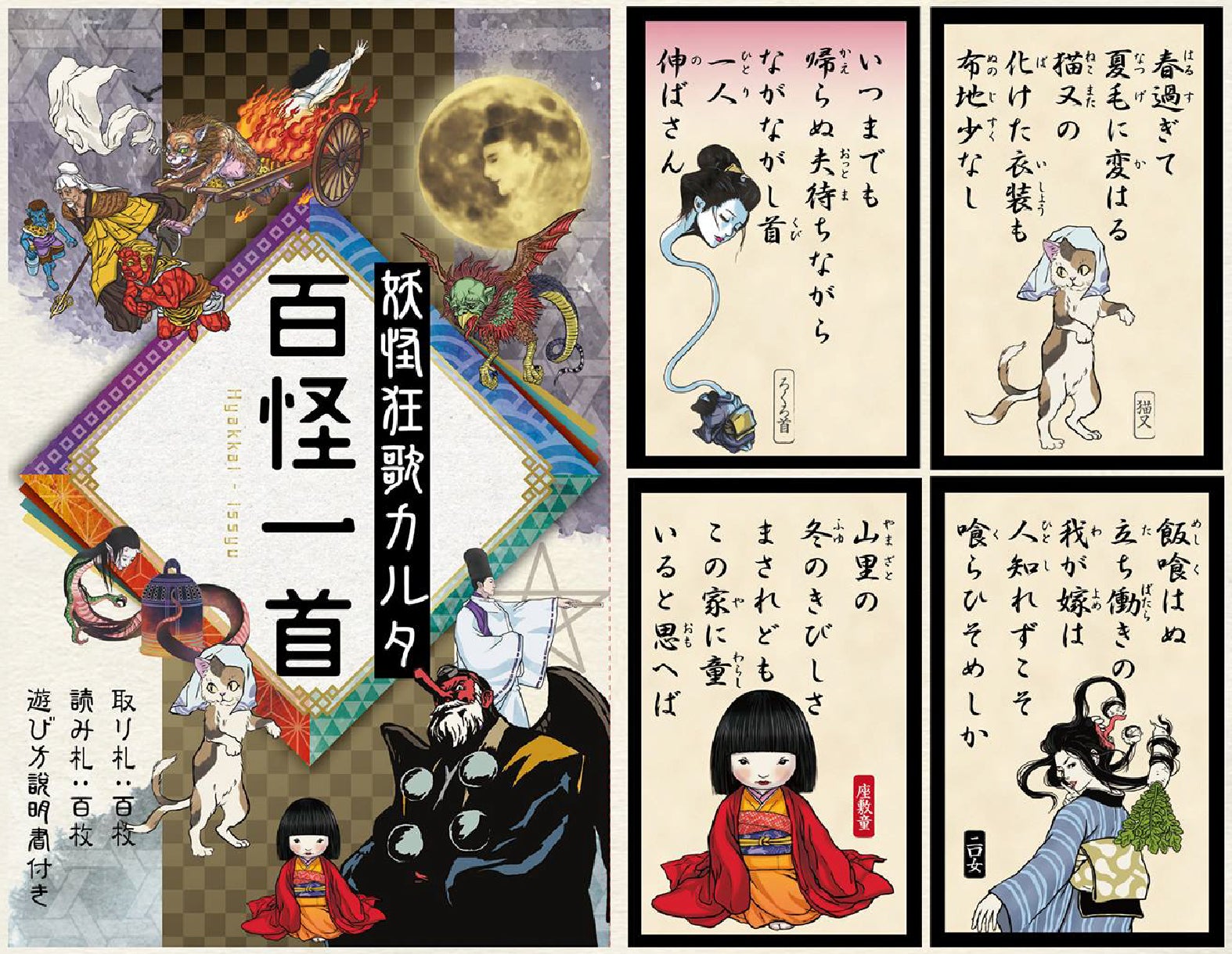「妖怪狂歌カルタ・百怪一首」は、百人一首の内容を全て妖怪や怪談、伝承や伝説に置き換えたオリジナルカルタです。読み札は百人一首と同様に五・七・五・七・七の短歌形式で構成され、下の句にあたる七・七を記した取り札と合わせて、それぞれ100枚ずつで成り立っています。百人一首に親しんでいる方はもちろん、坊主めくりもできるので、初めて触れる方やお子さままで、世代を問わず楽しめる内容です。