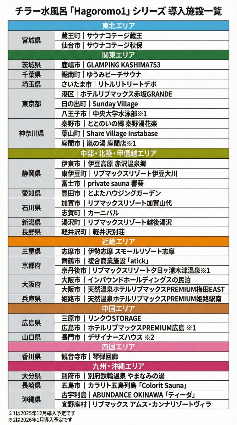 2025年10月には国内有数のリゾート運営会社・カトープレジャーグループが静岡県の「伊豆高原 赤沢温泉郷」にバレルサウナと合わせて「Hagoromo1t」を導入。