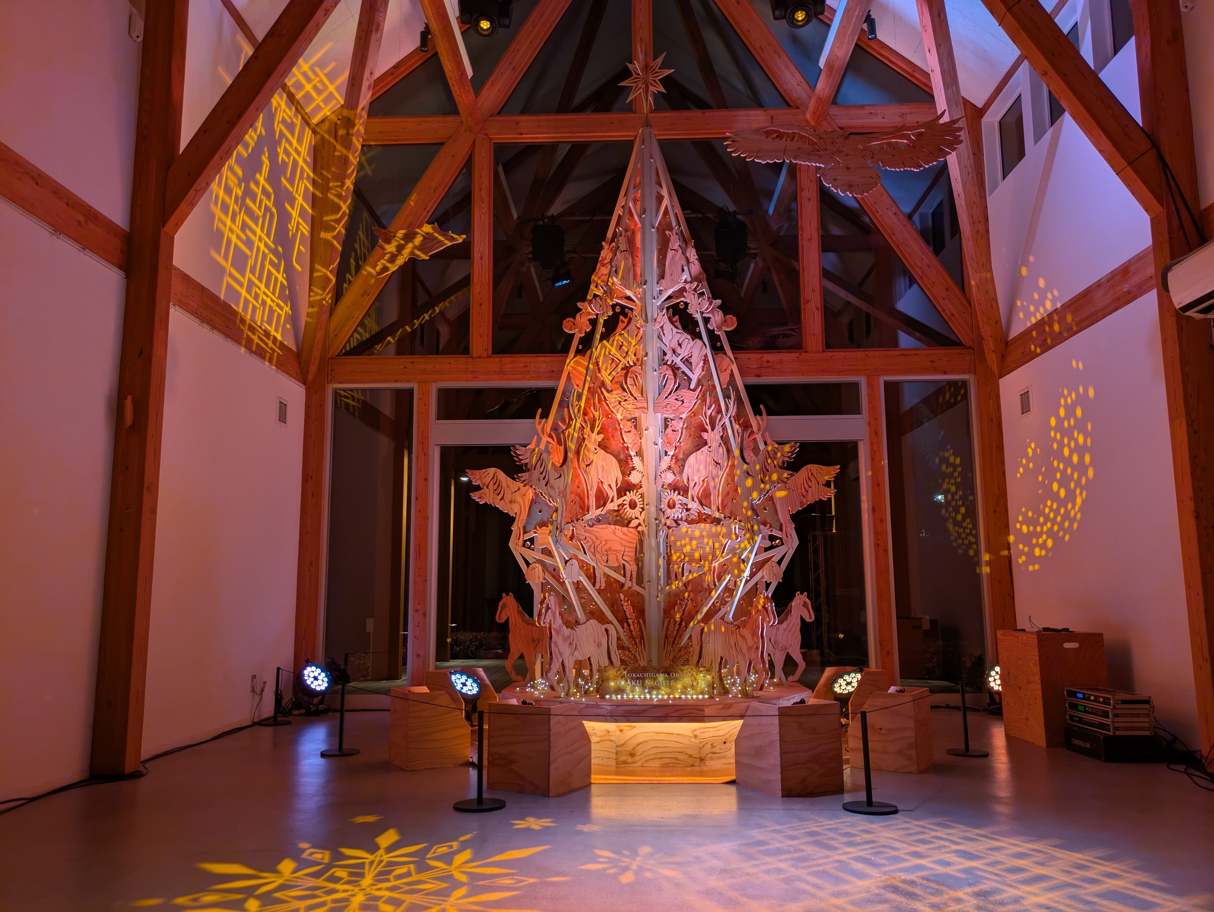 見どころ:館内の「からまつコリドー」に設えられたウッドツリーは、何年も大切に「使い続けて育てる」ことを念頭においたもの。十勝川温泉の「モール温泉」が持つ色合い「琥珀色」の光をまとい、地元十勝の動物や植物をあしらった、あたたかなツリー。今年はエントランスからの香りの演出なども加え、さらに温かいくつろぎの空間をお届けしました。