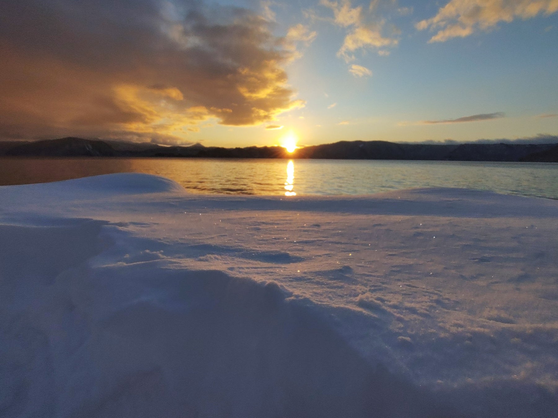 雪原が輝き、空と湖面が染まる美しい十和田湖の日の出に出会うスノーシューさんぽツアー。散策距離は500m前後と短めながら、十和田湖をよく知る案内人が準備を整えなければ訪れることのできない特別な場所で、朝焼けの時間から日の出を待ちます。