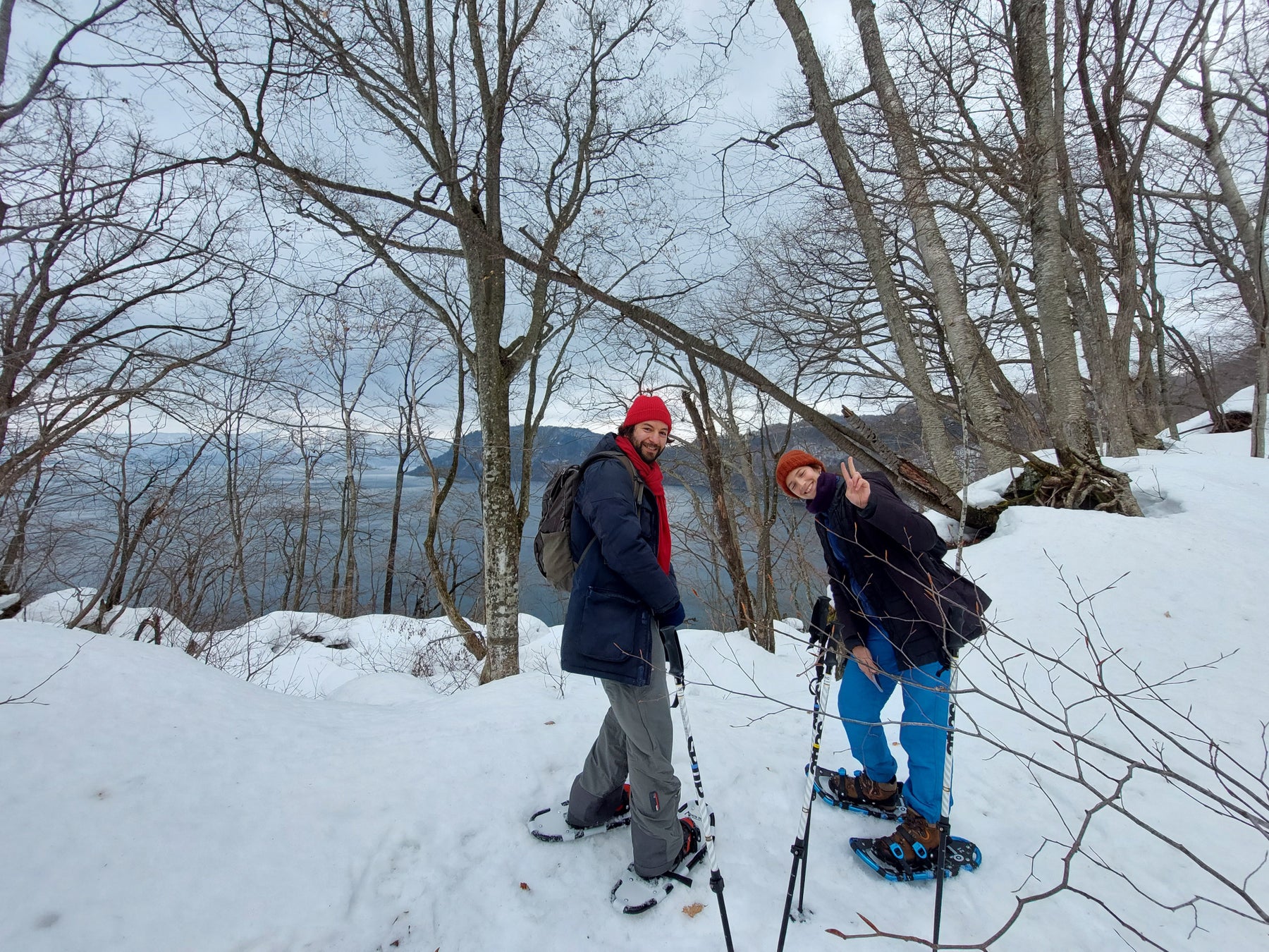 十和田湖畔休屋の“秘密の森”を歩く毎年恒例のスノーシューツアー。秘密の森は地元ガイドなしでは入ることができない場所にあり、平坦な森を抜け、時折斜面を登りながら山間の森を進むと、冬には普段見ることのできない十和田湖の中央の湖『中湖』を望めます。
