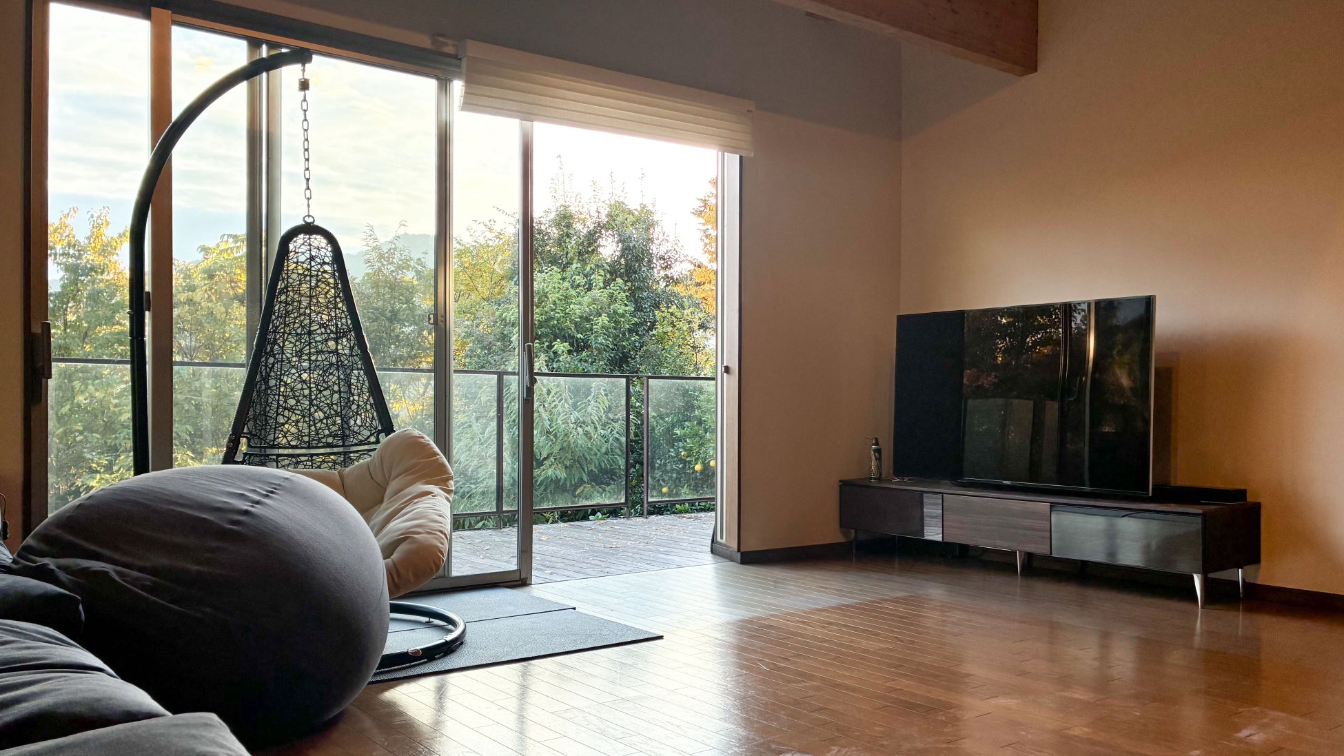 広々としたバルコニーの下には、落葉を一望できる開放的なプライベートサウナと、まるでグランピング施設のような焚き火スペースを設置。