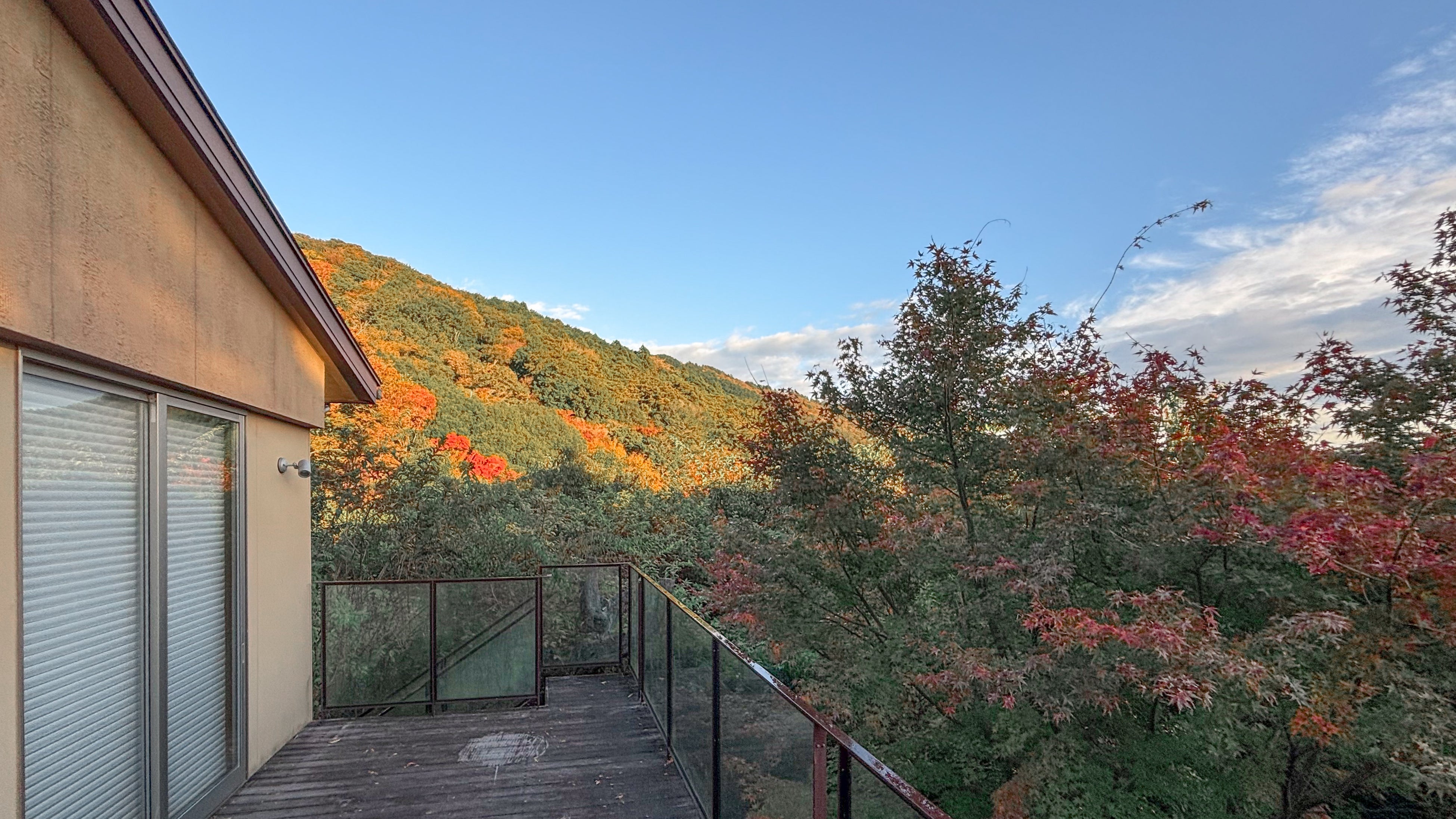 広々としたバルコニーの下には、落葉を一望できる開放的なプライベートサウナと、まるでグランピング施設のような焚き火スペースを設置。