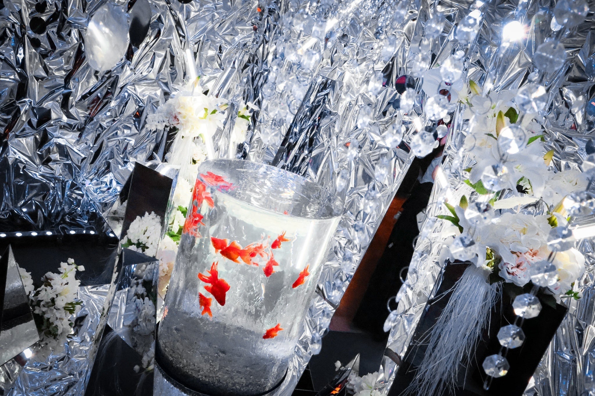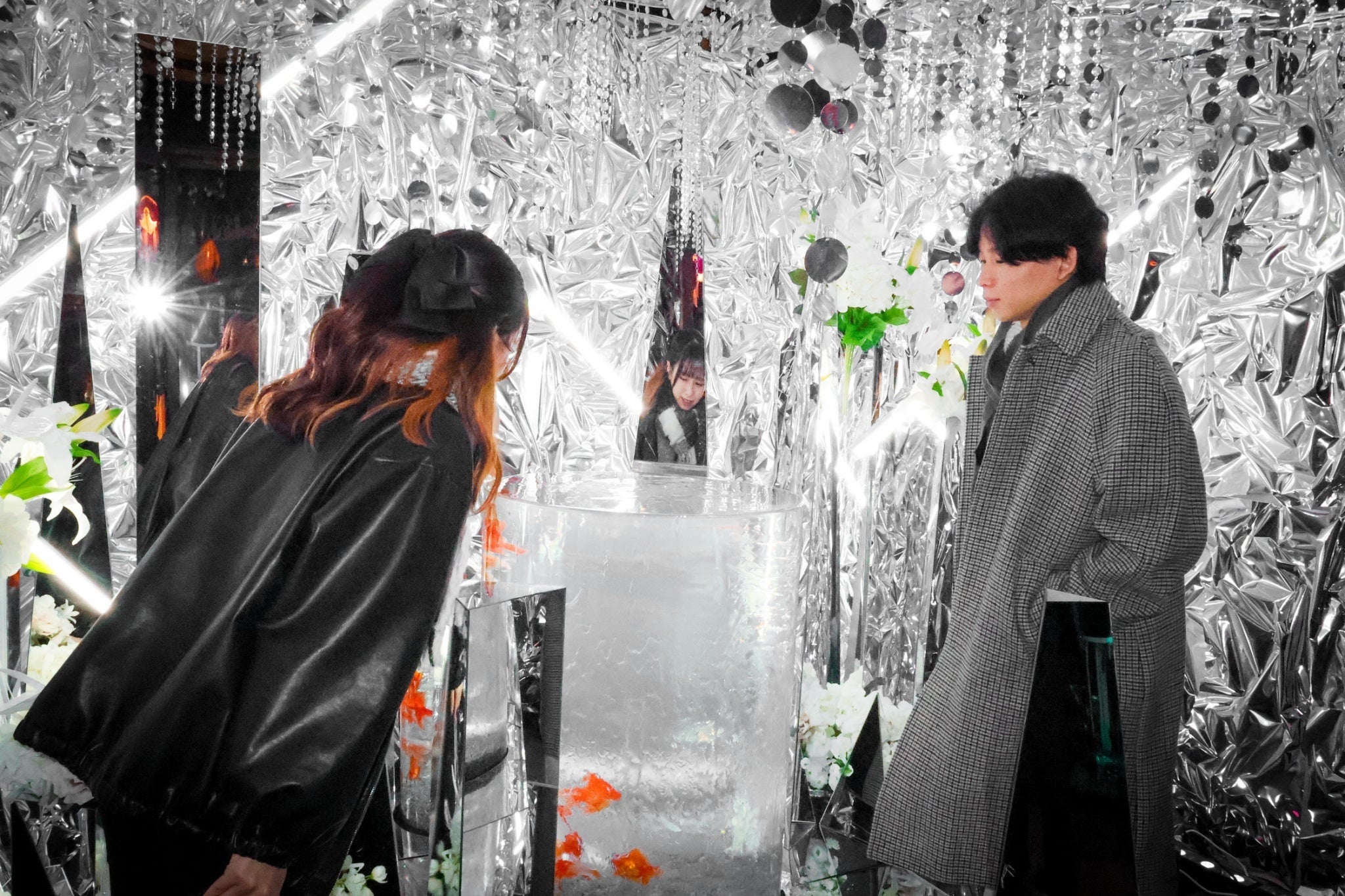 会場中央には、鏡面素材に包まれた円柱型の特設水槽を配置。クリスタルや鏡パネル、光の粒子のように降り注ぐライティングが織りなす環境は、まるで“氷の結晶で形成された水中都市”を思わせる壮大な銀世界を演出します。