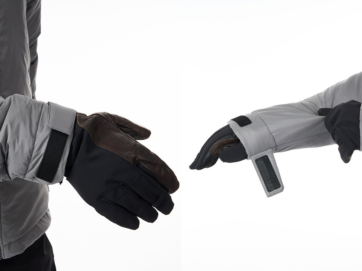厚手のグローブやアウターシェルを着用したままでも、スムーズに脱ぎ着できるサイズ感に設計。表地・裏地ともに撥水加工を施し、雪の付着による濡れのリスクを軽減します。