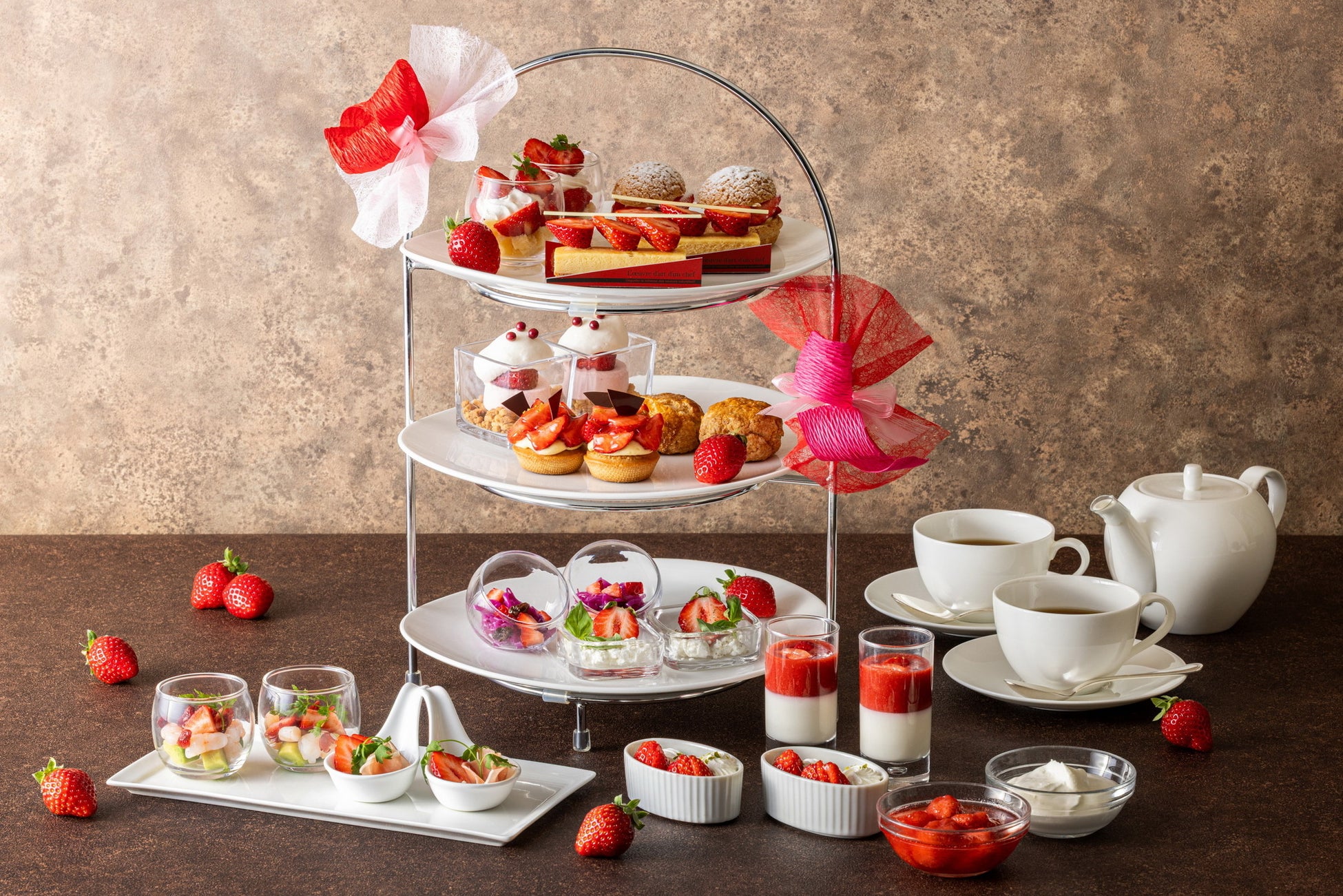 アフタヌーンティーやパフェなど、苺の王様“あまおう”を使用した各種メニューを堪能