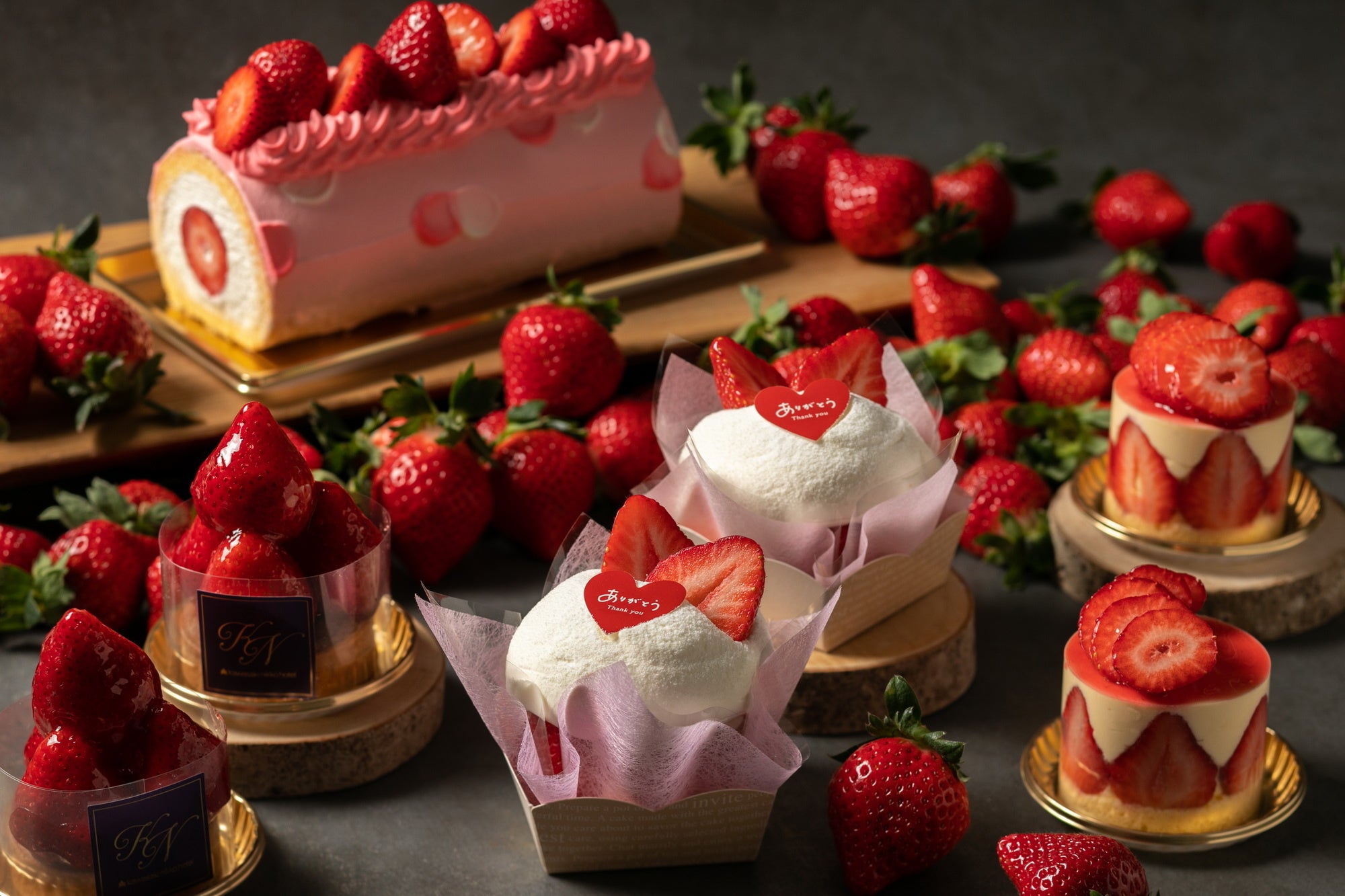 <上段>あまおうのグラスショート/あまおうのシュークリーム/あまおうのベイクドチーズケーキ