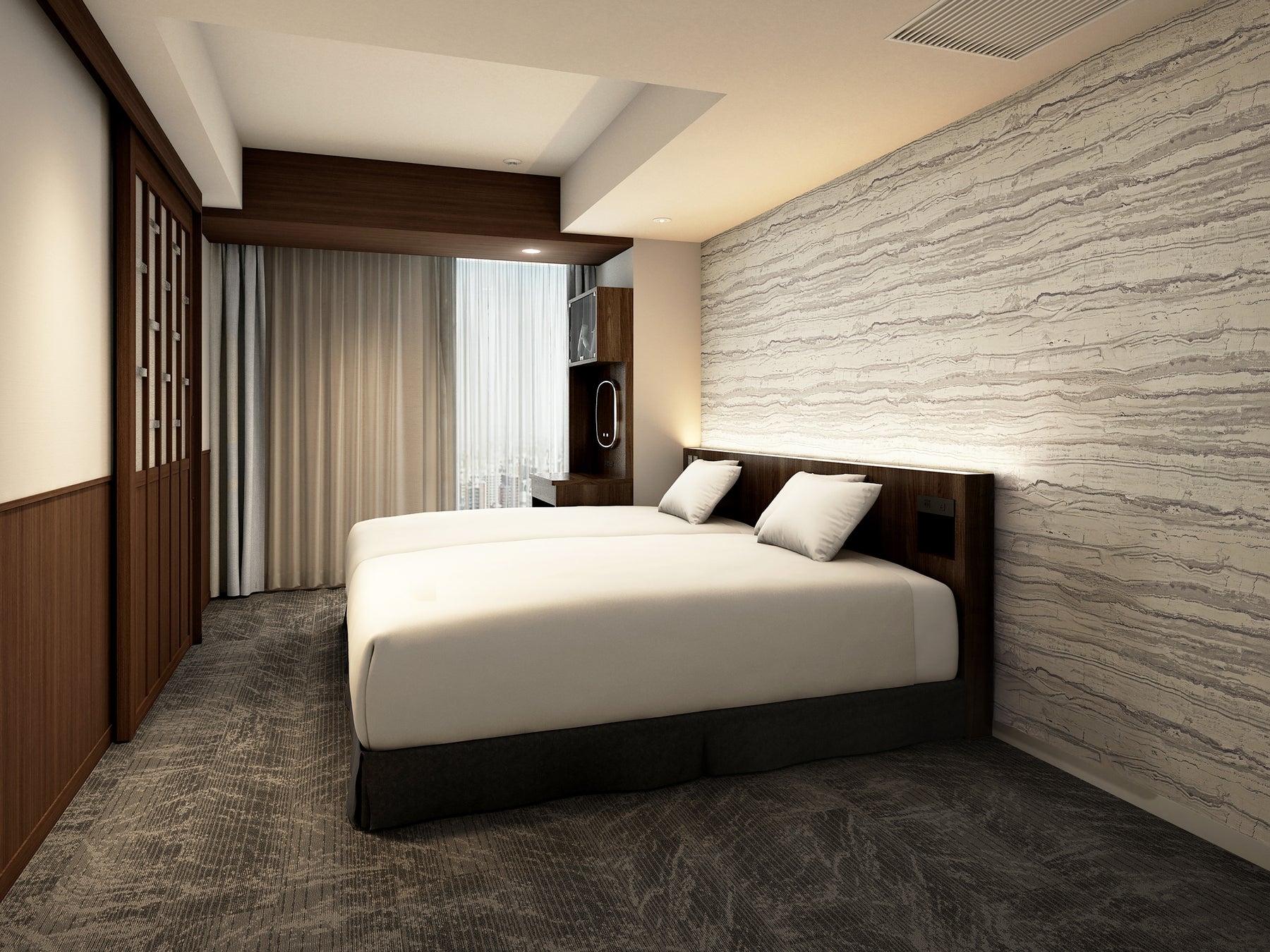 このたび、ホテルグレイスリー札幌の高層階エグゼクティブフロアに「デラックスツインルーム」32室が誕生いたします(うち16室は2月完成予定)。客室面積30㎡のゆったりとした空間設計に、北海道の景観の美しさを物語として体験していただけるよう、「雪景色」をテーマにした空間デザインを採用。厳冬を象徴する“吹雪”をデザインモチーフにした客室タイプでは、濃淡の木製家具をバランスよく配置し、吹雪の中の温もりを感じられる空間に仕上げています。