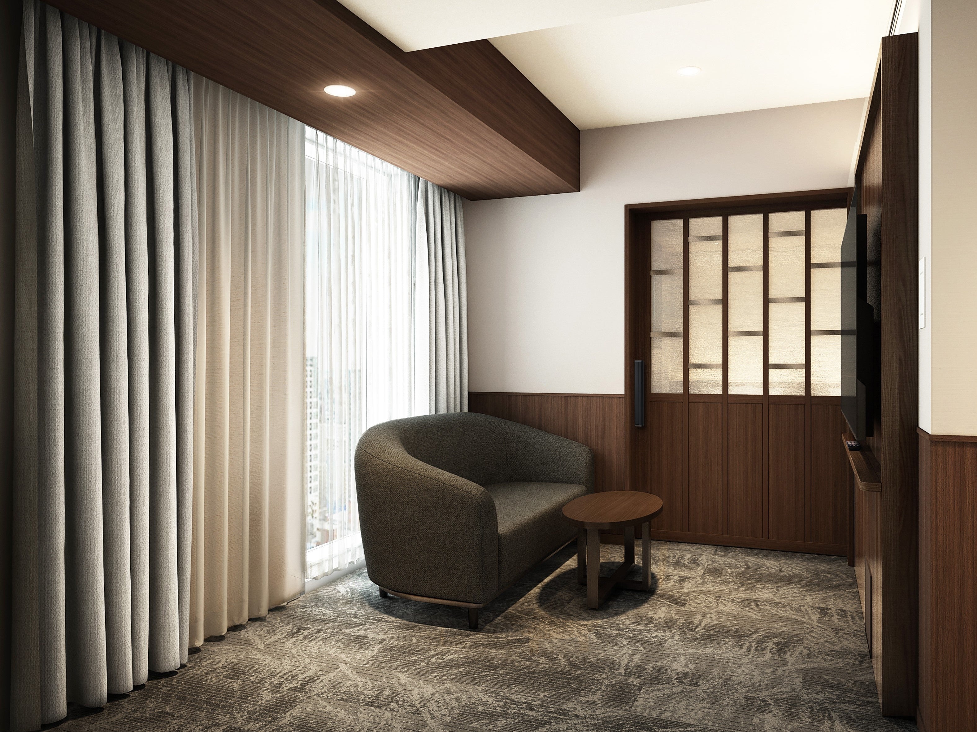 このたび、ホテルグレイスリー札幌の高層階エグゼクティブフロアに「デラックスツインルーム」32室が誕生いたします(うち16室は2月完成予定)。客室面積30㎡のゆったりとした空間設計に、北海道の景観の美しさを物語として体験していただけるよう、「雪景色」をテーマにした空間デザインを採用。厳冬を象徴する“吹雪”をデザインモチーフにした客室タイプでは、濃淡の木製家具をバランスよく配置し、吹雪の中の温もりを感じられる空間に仕上げています。