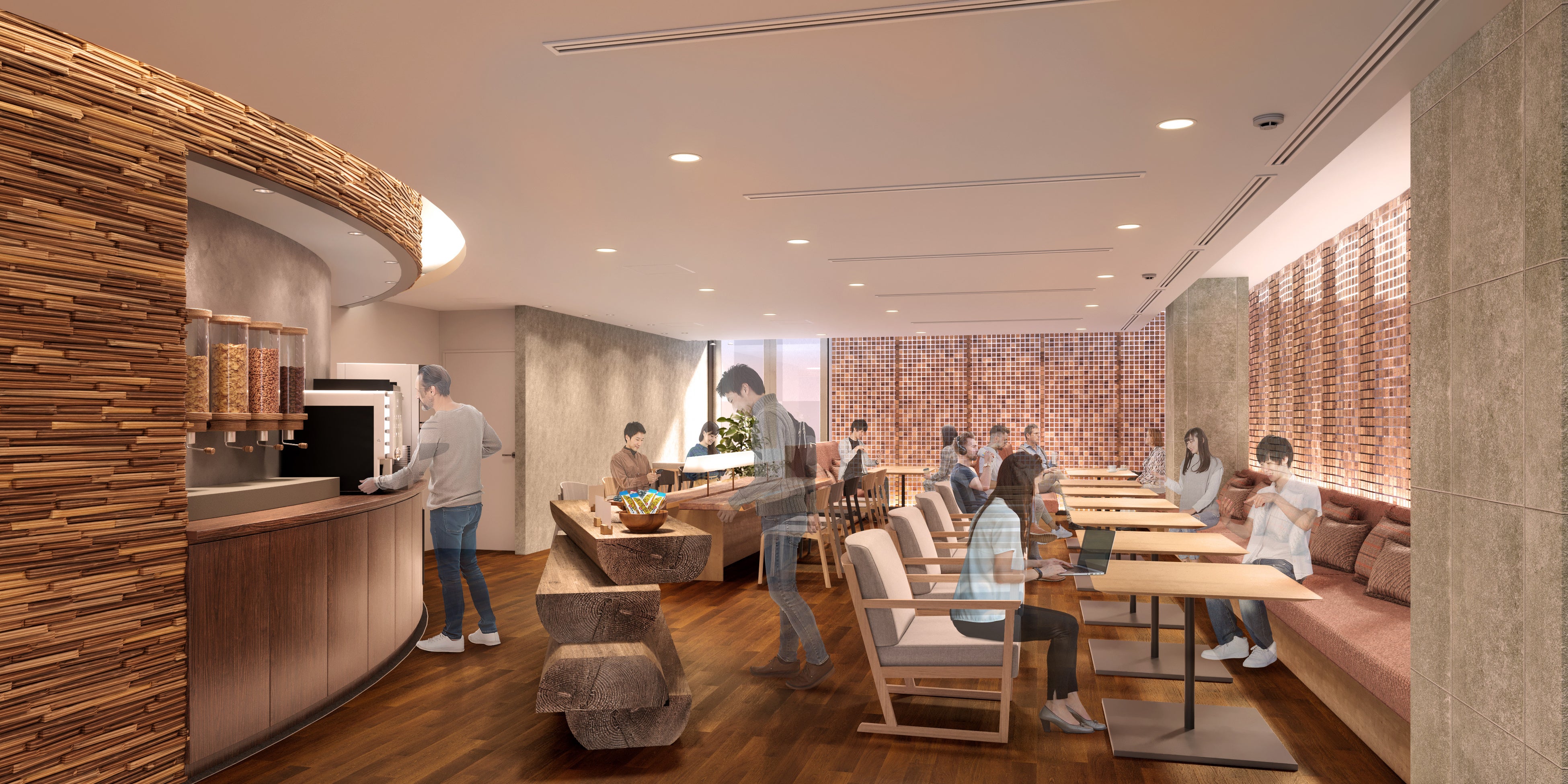 また、フロント階では、エレベーターを降りると札幌の大地で育った木々が香るホールがお客さまをお迎えし、さらに進んだロビーには、道南・厚沢部町のウッドチップを敷き詰めた靴を脱いでリラックスできる「空っぽスペース」、静かにせせらぐ水盤など、自然の香りと音、大きな窓から差し込む光に満ちた空間にリニューアルしました。北海道らしい穏やかさとまるで森の中にいるかのような静けさが漂う、「ここから旅が始まる」安らぎの時間をご提供いたします。ロビーからつながるラウンジも今回、ゲストラウンジ「Executive Lounge」として、道南・今金町からの2mを超える丸太のテーブルをシンボルに、自然のぬくもりを感じられるしつらえに刷新。札幌の深煎り文化を取り入れたオリジナルコーヒーのご提供に加え、カクテルタイムには北海道産の日本酒やワイン、燻製など、常時3種類のメニューをご用意しております。