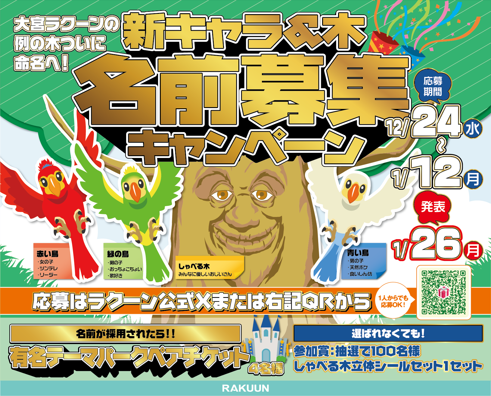 株式会社浜友E.F.(本社:静岡県浜松市 代表取締役社長:大石 恵司)が運営する「大宮ラクーン」のマスコットキャラクター「しゃべる木」が、12月24日(水)に新たに仲間の鳥3人を連れてリニューアルいたしました。