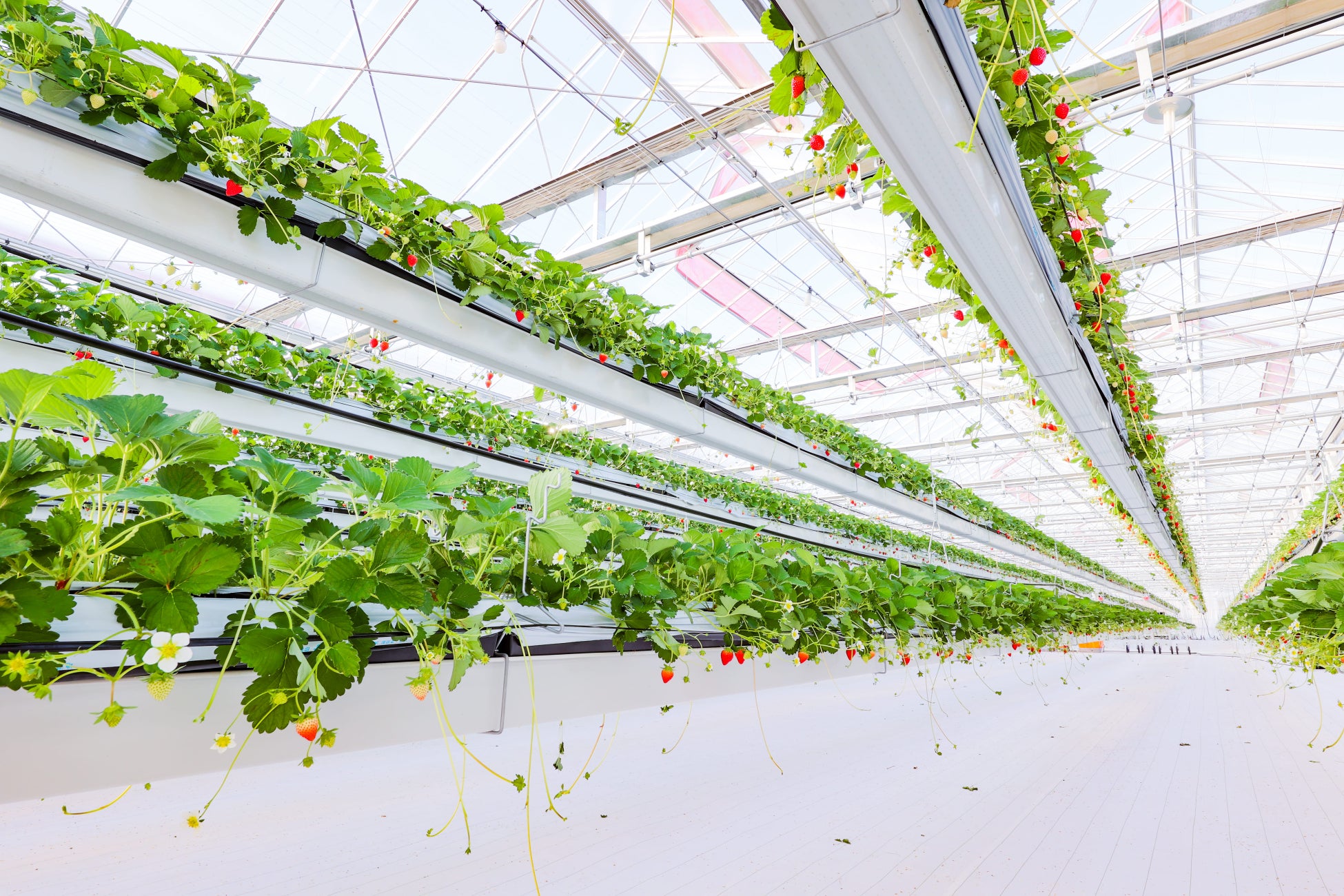 「出雲ICHIGO縁」では、中国地方最大規模となる可動式空宙プランターで約5万株のいちごを栽培。プランターの高さを調節できるため、立った状態で収穫でき、快適にいちご狩りを楽しめます。