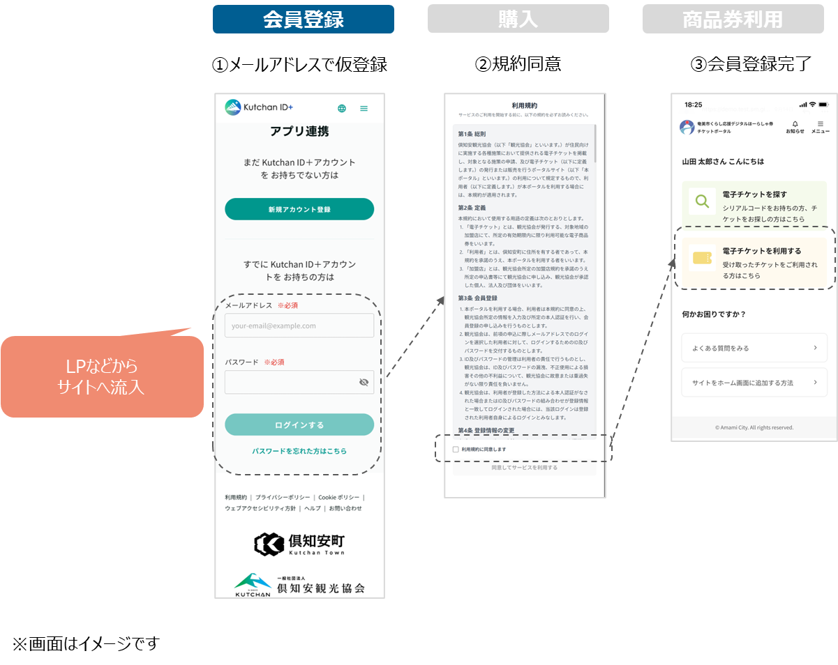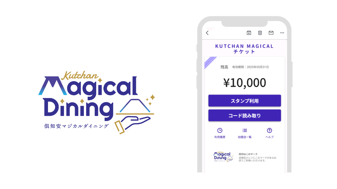 2025年秋プレミアム飲食券事業「Kutchan Magical Dining」は、「e街チケットポータル」を基盤とした「Kutchan MAGICAL DINING」の専用サイトより、額面10,000円分のプレミアム付き電子飲食券「KUTCHAN MAGICAL チケット」を1枚5,000円(プレミアム率100%)で販売する施策であり、既に2,000枚を完売しております。なお、専用サイトは、デジタル町民証明サービス「Kutchan ID+」と連携しており、事前に「Kutchan ID+」へ登録し、マイナンバーカードを用いた本人確認を行うことで、「KUTCHAN MAGICAL チケット」購入サイトへのログイン時に倶知安町民であることを判別できる仕組みとなっています。「KUTCHAN MAGICAL チケット」の購入時は、「Kutchan ID+」に登録したメールアドレスとパスワードで購入サイトにログインし、クレジットカードで決済いただくことで購入いただけます。