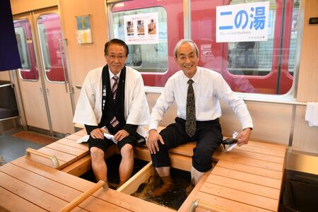 足湯列車に乗る菰野町長(左)と菰野町観光協会長(右)