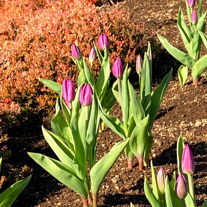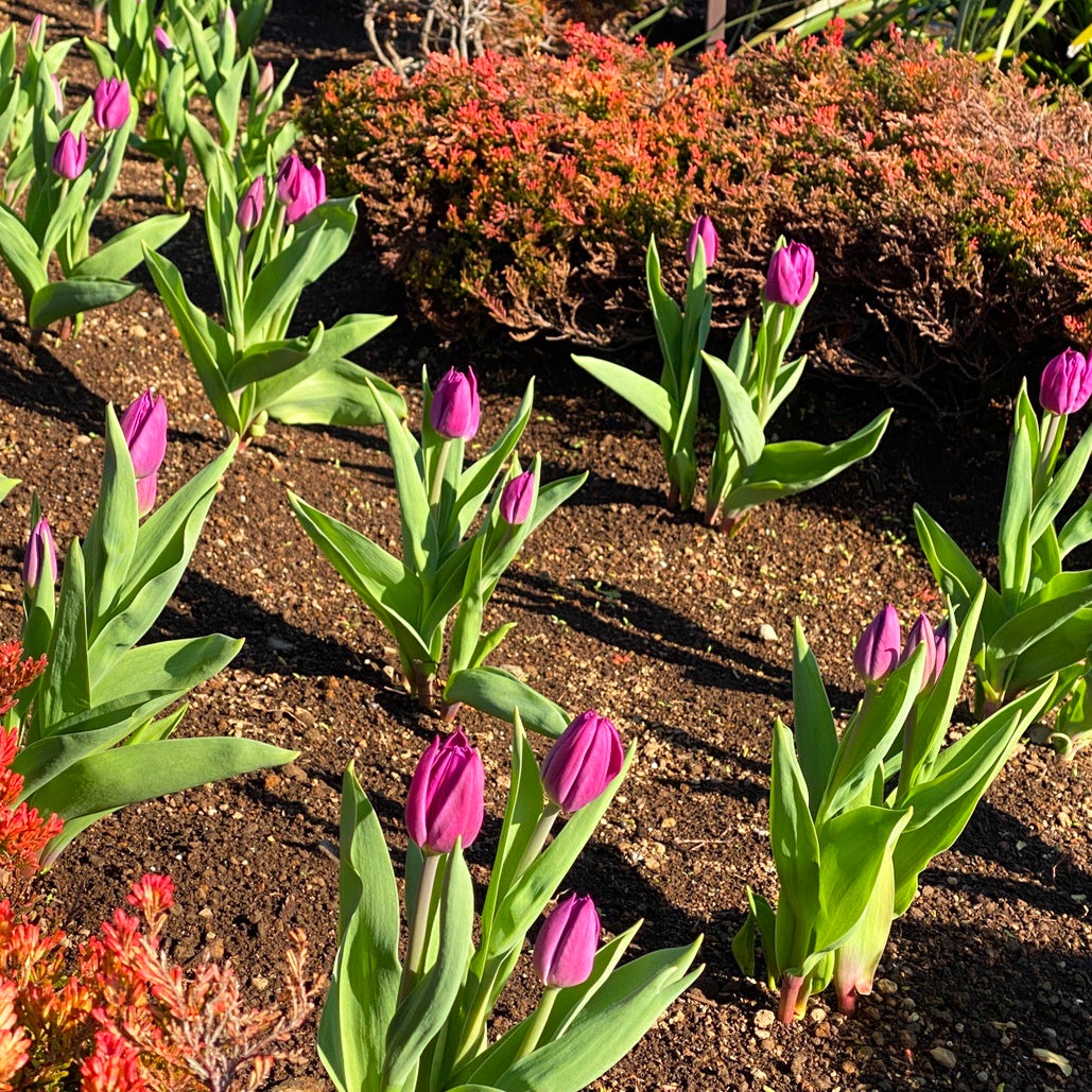 アイスチューリップは、園内エントランス付近の花壇(約1,000㎡)にカリー、ストロングゴールド、イエローフライト、ピンクツイスト、ラップトップ、プリンセスイレーネ、ハニーバンデルモスト、ダイナスティ、ファーストクラスといった色とりどりの品種を3,500球植栽しております。見頃は年末年始と予想され、1月下旬頃まで花を咲かせます。