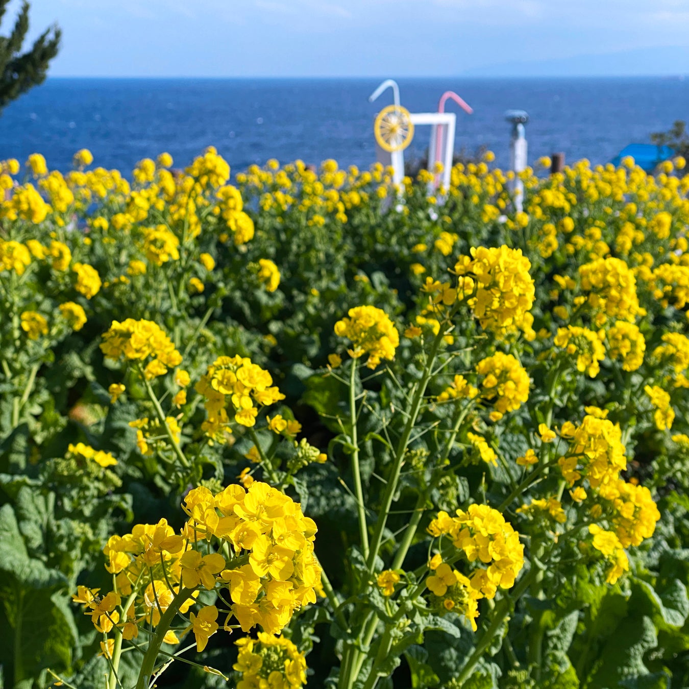 当園の菜の花は、相模灘と伊豆大島を望む岬のエリア(約1,000㎡)の花壇に、普通咲き種「栄華」を約20,000株植栽しております。