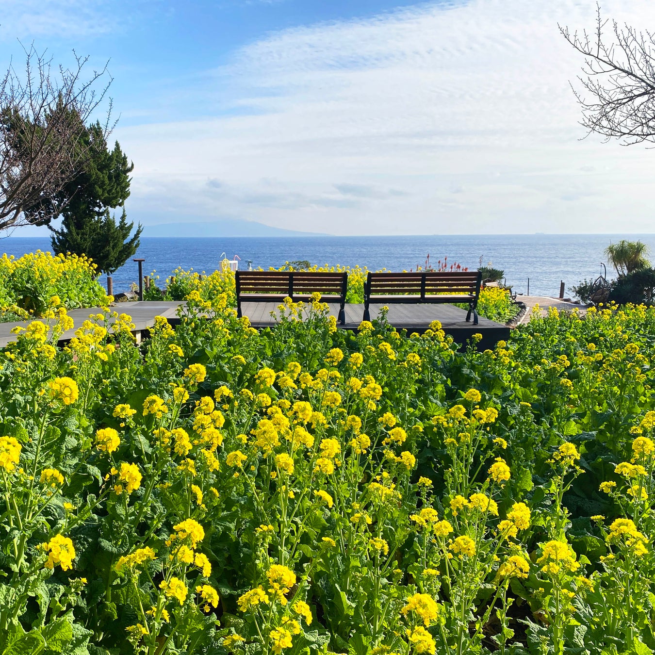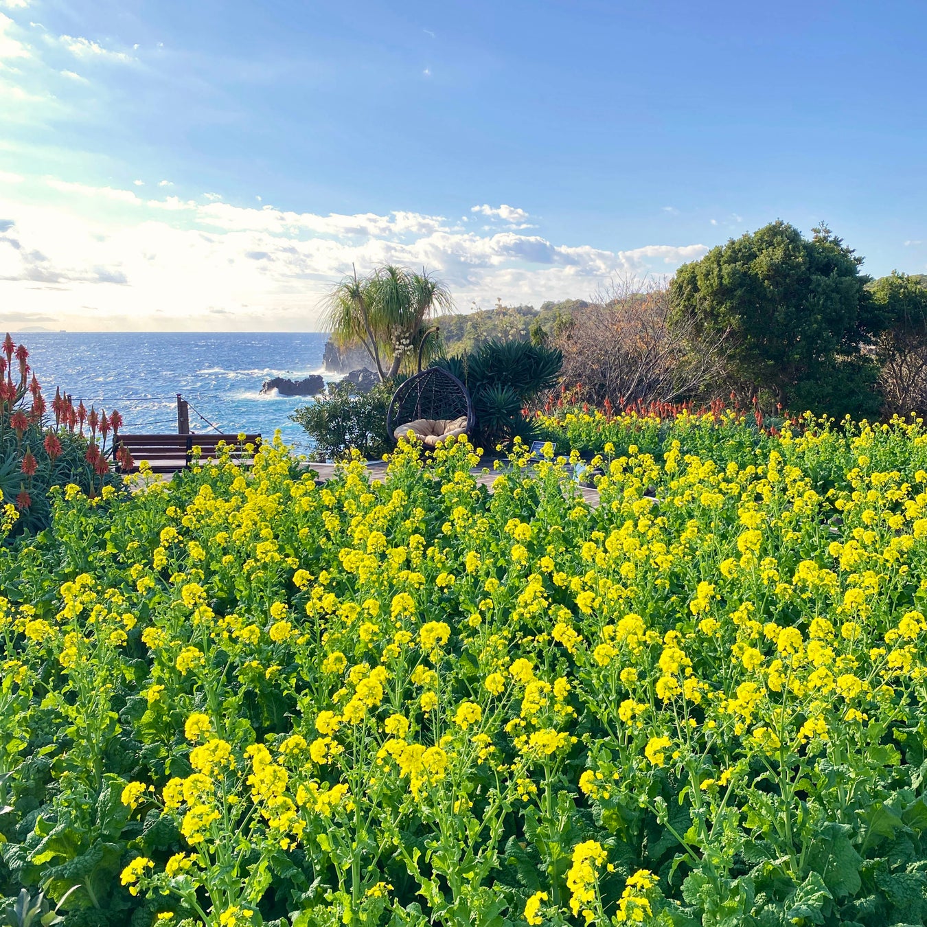青い空と海に映えたカラフルな花々が咲き、一足早い春の訪れを告げる園内で、ゆったりとしたひとときをお過ごしください。