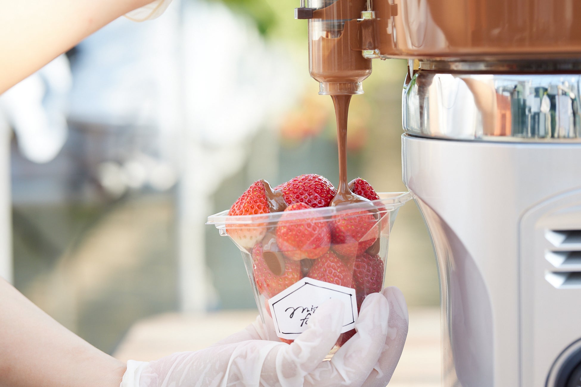 プレミアムプランはチョコレートソースや10種類以上の豊富なトッピングが何度でも利用可能です。摘んだいちごをカップに盛り、濃厚なチョコレートソースをスタッフが注ぎ込みます。そのあとは自分好みのトッピングが楽しめます。カラフルシュガーやマシュマロに加え、新しいトッピングが仲間入り。