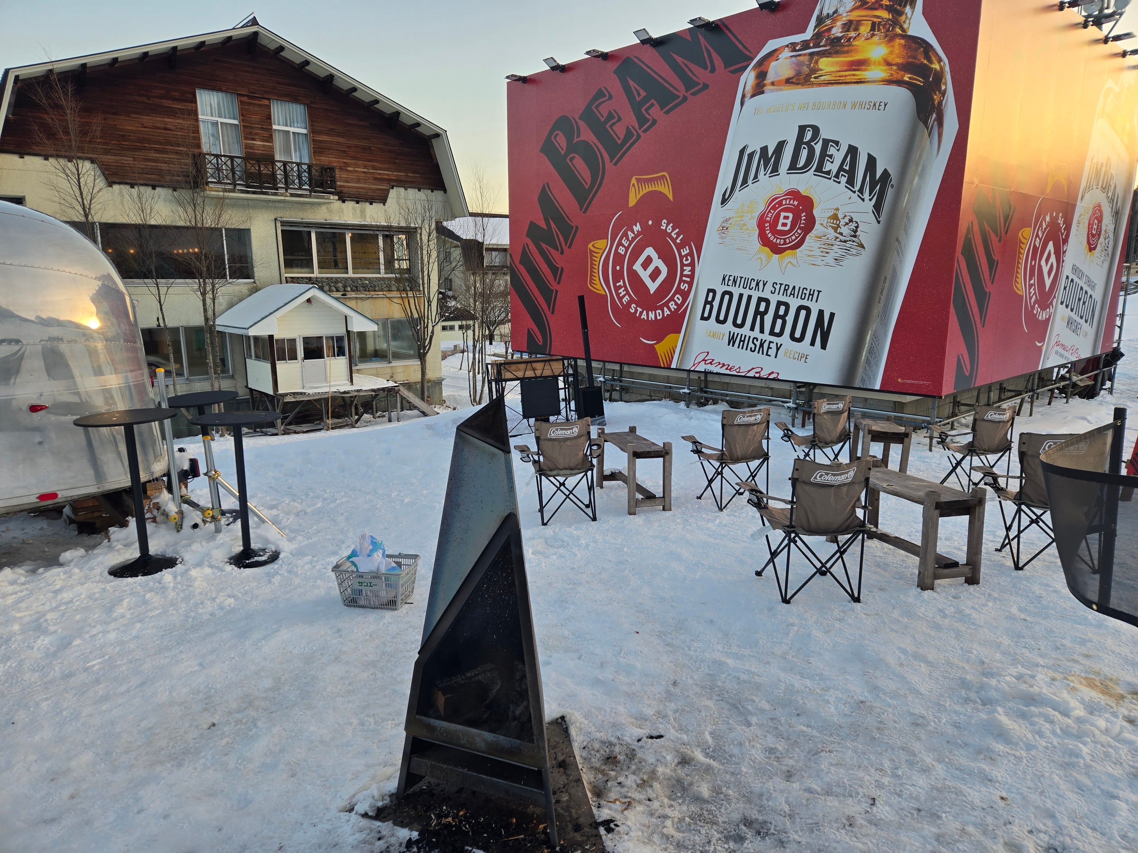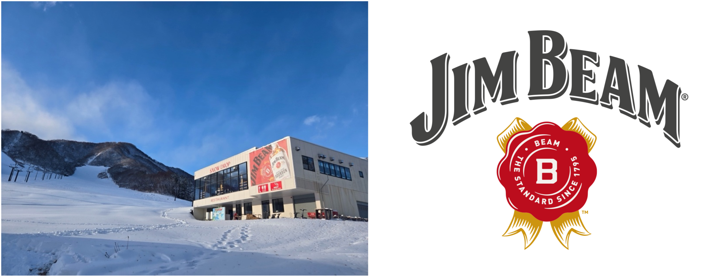 キッチンカーだけでなく、レストラン「スノードロップ」に専用カウンターが登場するほか、旧チケットセンター壁面などにも巨大なジムビーム看板を設置し、スキー場全体を盛り上げます。
