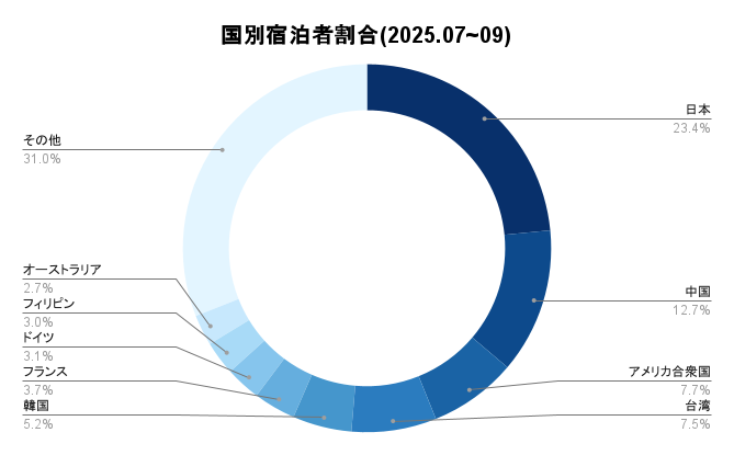matsuri technologiesの運営する施設に宿泊したゲストの2025年7月〜9月のレポートでは、宿泊したゲストの国別割合において、2025年4月〜6月のレポートと比較して日本の割合が9.9%増加しました。同様に、中国の割合も2.9%増加し、順位を上げています。