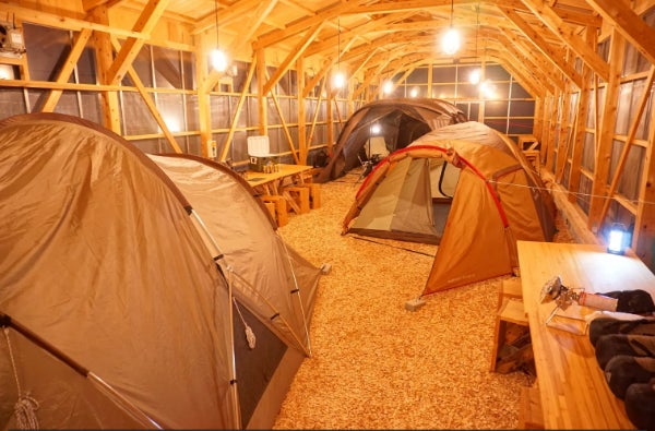 「冬キャンプ」は、最大80名が飲食可能な木造ハウス内にテントを設営し、雨や雪を気にすることなく楽しめる新感覚のキャンププランです。テントや備品は施設のものをご利用いただけるため、手ぶらでのキャンプも可能です。