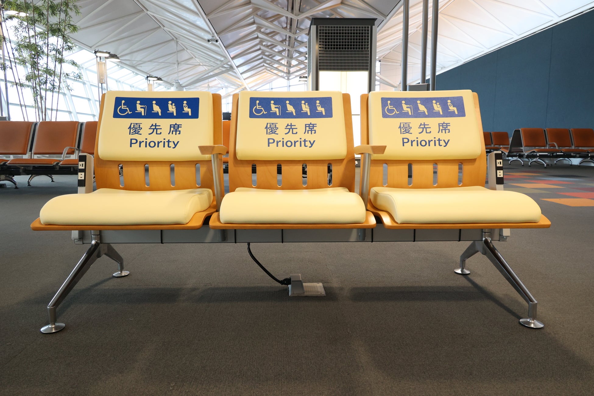 しかし、2025年2月に開港から20年を迎え、空港を取り巻く環境は大きく変化しております。こうした状況を受け、再度空港のUDのあり方を見直すべく、2024年2月に開港後初めてとなる、障害等当事者による「UD総点検(※)」を実施。同年3月には、総点検であがった課題について、学識経験者・有識者、障害等当事者団体、空港島内事業者からなる「UD懇談会」を立ち上げ、課題の解決に取り組んでおります。その一環として、この度、第1ターミナル搭乗待合エリアに新たな優先席を導入します。