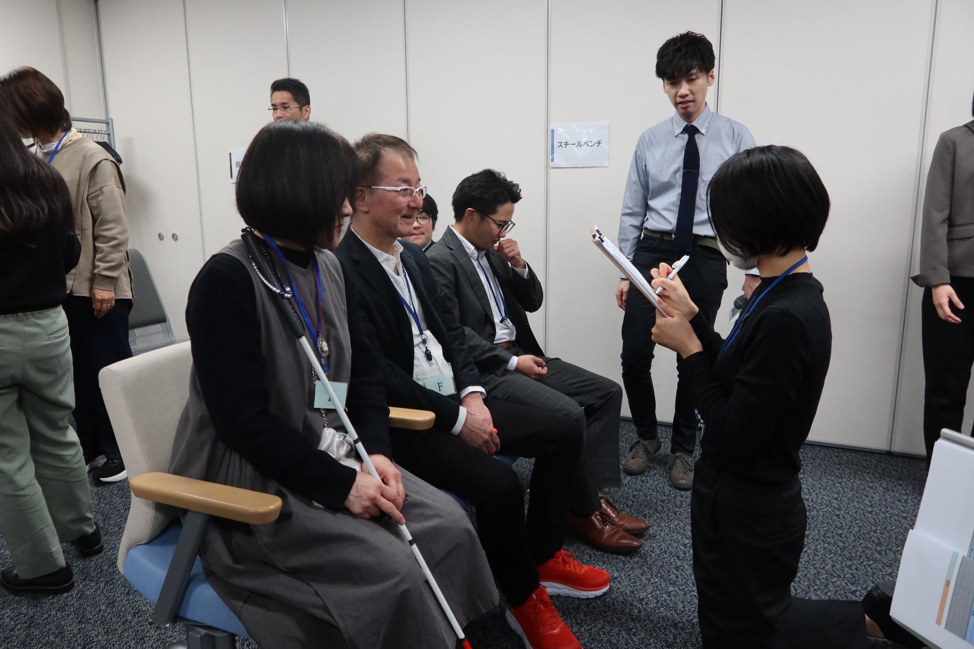 従来の優先席で生じていた「表示が目立ちにくい(健常者が占有してしまう)」、「深く腰掛ける設計のため、立ち上がるのが大変」といった課題の解消に向けて、2024年12月にUD懇談会にて検証会を実施し、多様な属性の方々にさまざまな種類のベンチを試していただき、データを収集しました(表示の色、座面の高さ、必要な付加機能など)。得られたデータをもとに、メーカー協力のもとセントレア独自の仕様を多数盛り込み、新たな優先席を製作しました。
