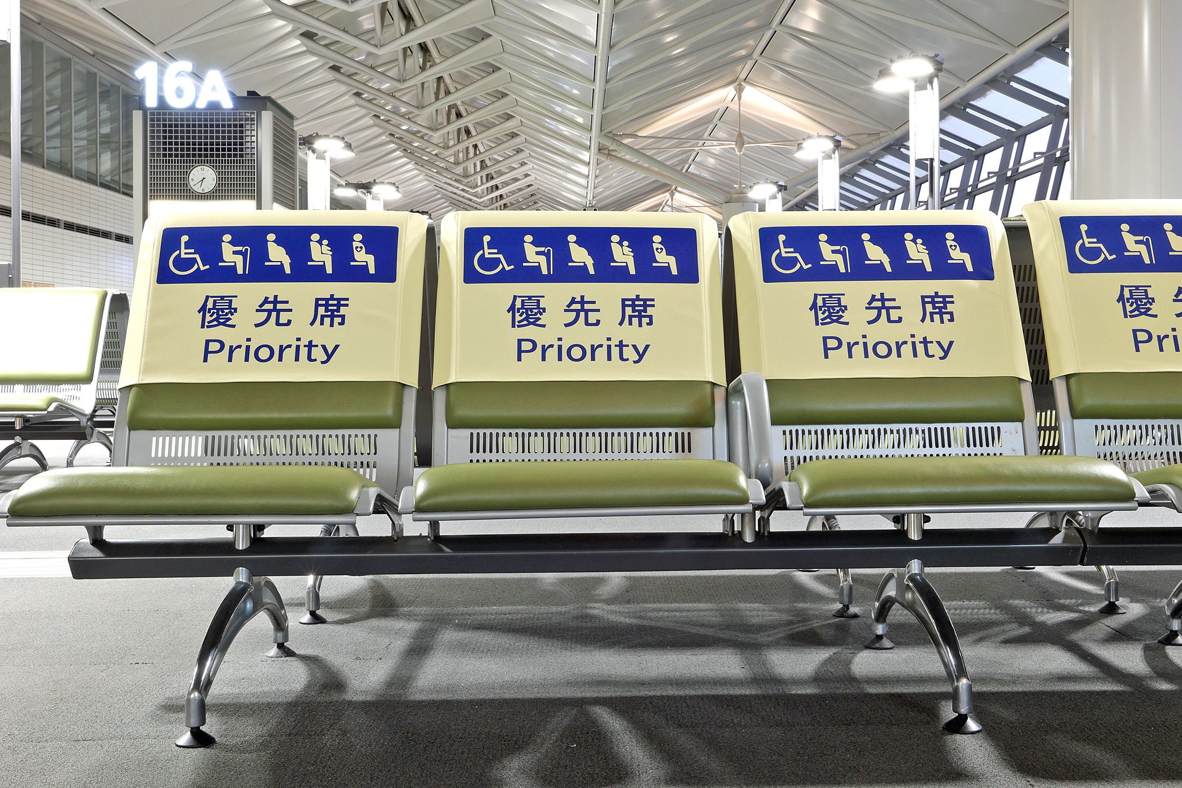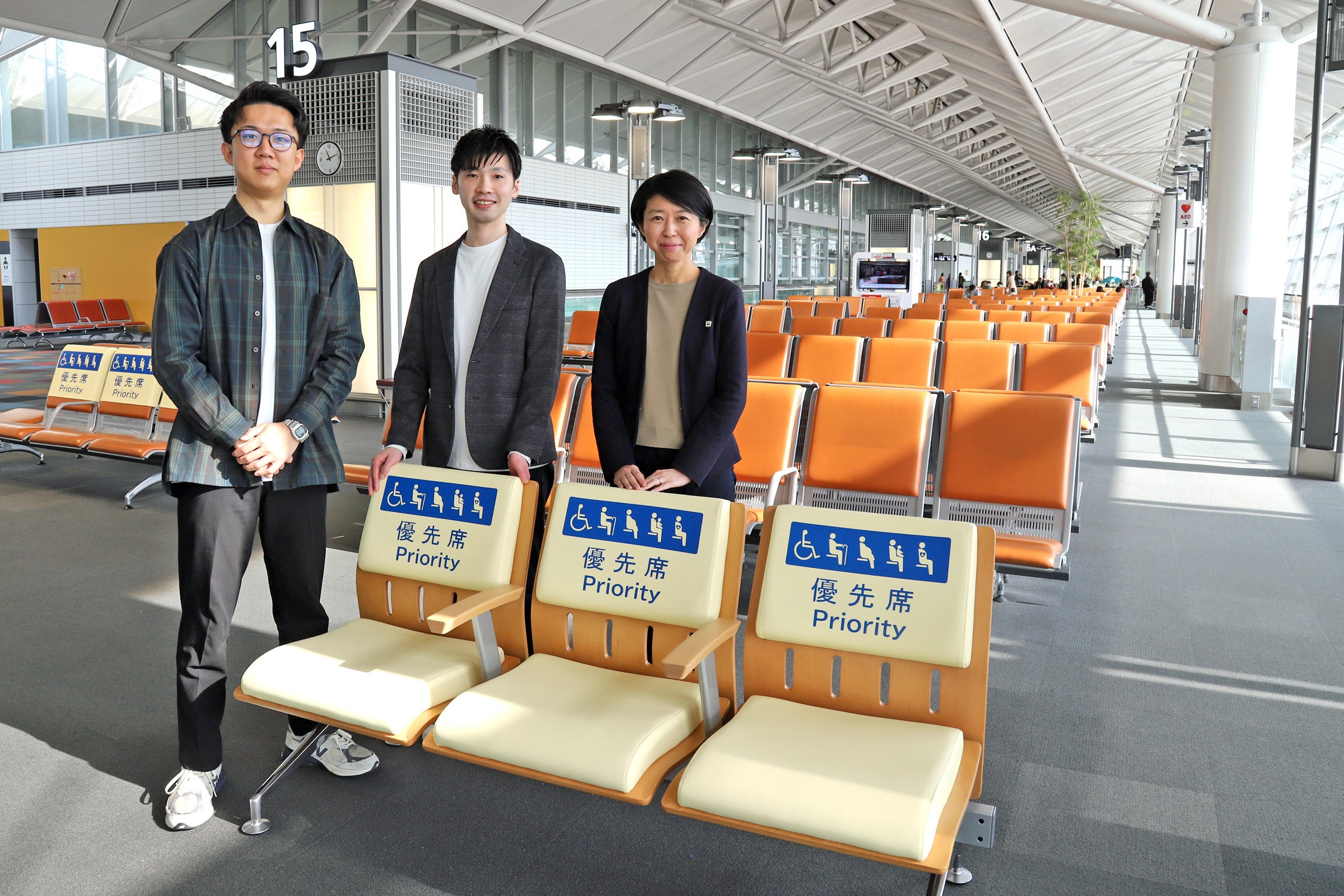 しかし、2025年2月に開港から20年を迎え、空港を取り巻く環境は大きく変化しております。こうした状況を受け、再度空港のUDのあり方を見直すべく、2024年2月に開港後初めてとなる、障害等当事者による「UD総点検(※)」を実施。同年3月には、総点検であがった課題について、学識経験者・有識者、障害等当事者団体、空港島内事業者からなる「UD懇談会」を立ち上げ、課題の解決に取り組んでおります。その一環として、この度、第1ターミナル搭乗待合エリアに新たな優先席を導入します。