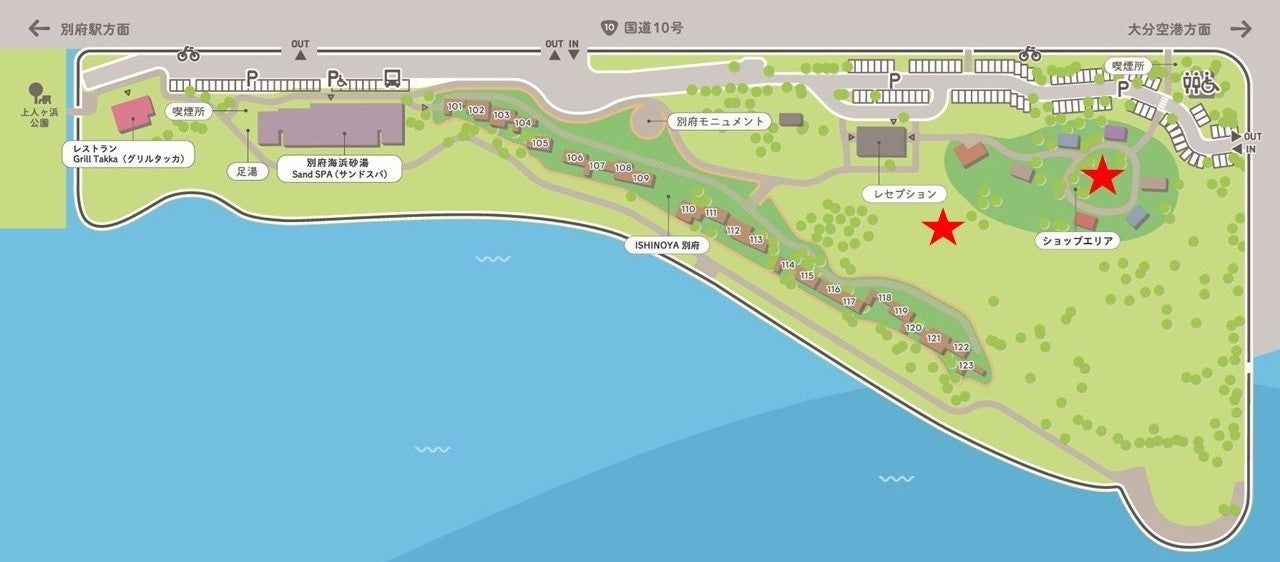 「SHONIN PARK」は2025年7月にオープンした、大分県別府市の複合型リゾート施設です。エリア内には宿泊コテージ「ISHINOYA別府」、砂湯を備えた温浴施設「Sand SPA(別府海浜砂湯)」、地元食材を活かしたグリル料理を提供するリゾートレストラン「Grill Takka」、飲食・物販など多様な魅力が集まるショップテナントエリアを展開し、滞在・癒し・食を通じて別府の魅力を五感で体感できる空間となっております。