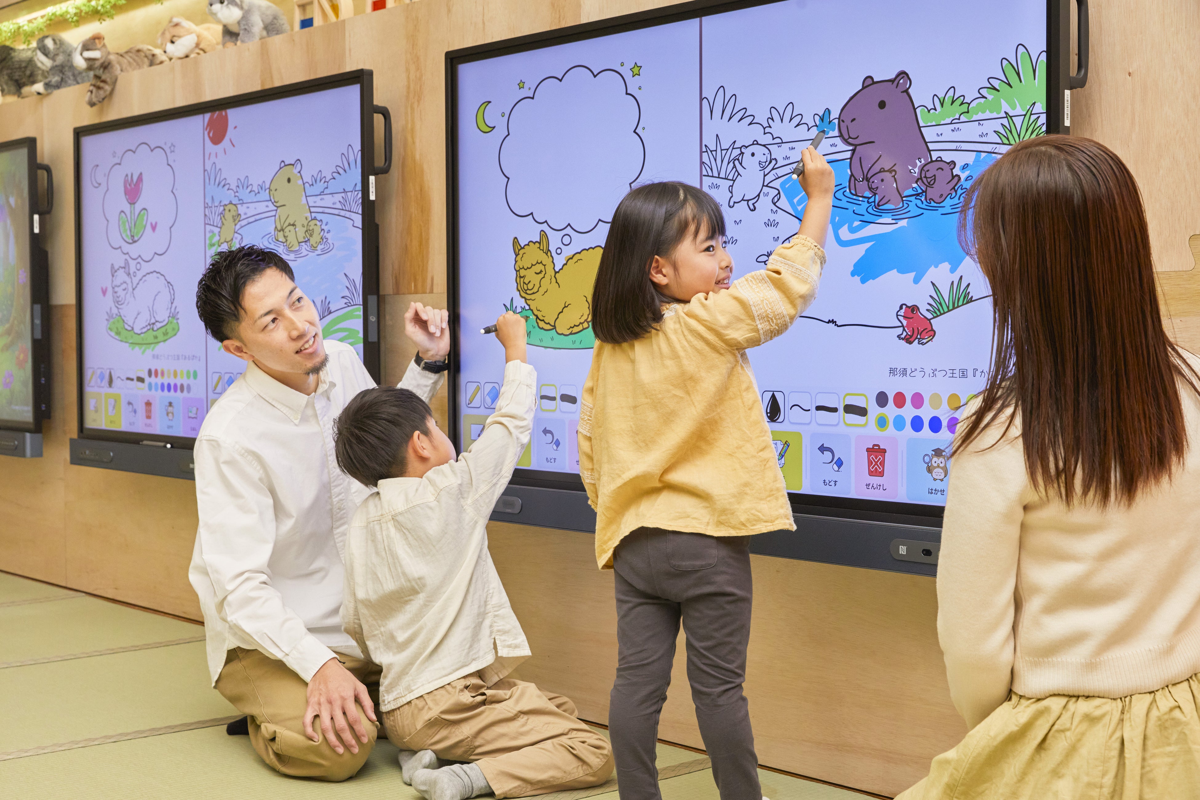 大きな画面を使って、色を塗ったり、線を描き足したりしながら、思い思いの表現を楽しめる大型モニター。お絵かきの題材には、マヌルネコやスナネコ、アルパカなど、ホテル近隣の「那須どうぶつ王国」で人気の動物たちが登場します。用意されている下絵は、あえて余白を残した構成で、アルパカが見ている夢を描き足したり、スナネコが見つけたものを想像して描いたりと、子どもが描き加えることで、はじめて一枚の絵が完成します。