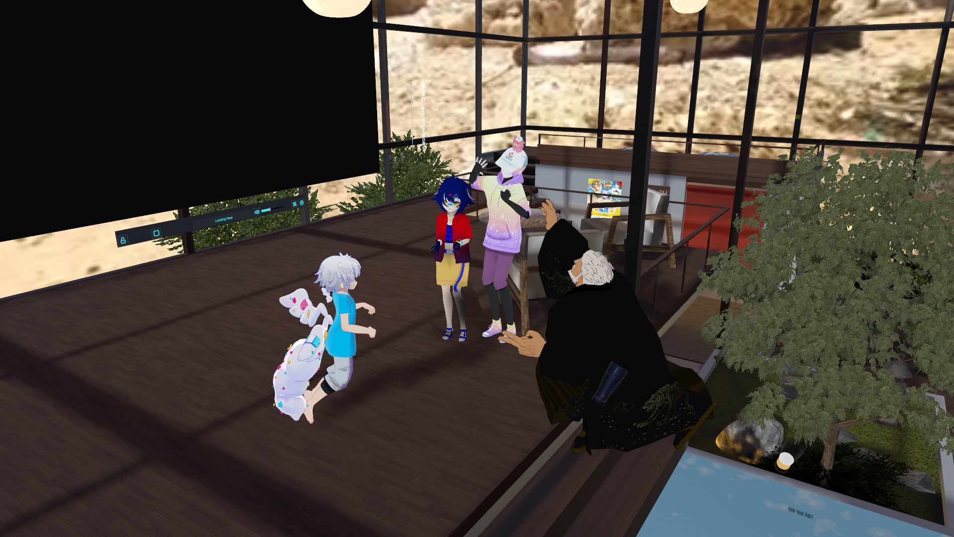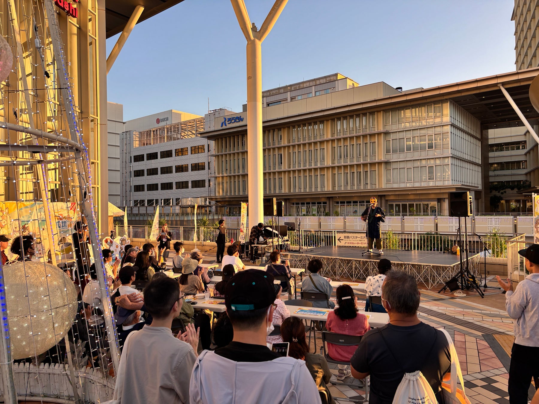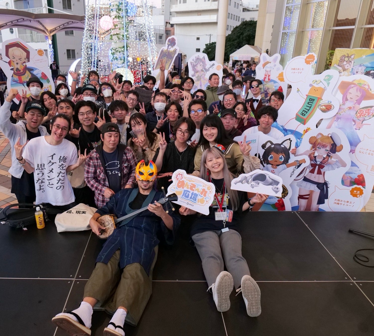 イベント終盤、530(ゴサマル)氏による三線ライブ では、三層配信ならではの象徴的な場面が生まれました。沖縄のリアル会場で乾杯の声が上がると、VRChat内でもアバターたちの乾杯の声も同時に上がり、そのVRChat内の様子を大阪のリアル店舗で上映され、3つの場所がひとつにつながる瞬間であった。