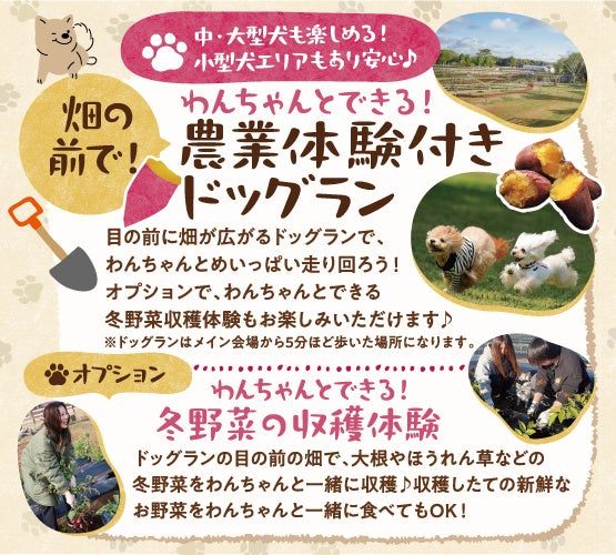 おいものテーマパークで飼い主さまがわんちゃんと一緒にお散歩や収穫体験、お食事などを思う存分に楽しめるオリジナルイベントを開催します。