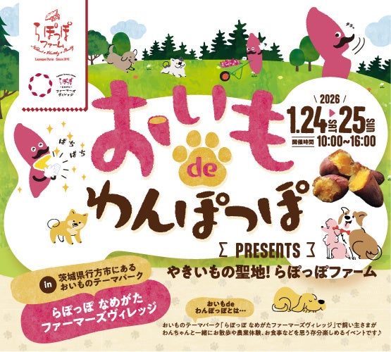 白ハト食品工業株式会社(本社︓大阪府守口市、代表︓代表取締役社長 永尾 俊一)が運営する、体験型農業テーマパーク らぽっぽ なめがたファーマーズヴィレッジ(所在地︓茨城県行方市宇崎1561)では、2026年1月24日(土)・25日(日)にわんちゃんと楽しむ︕「おいもdeわんぽっぽ!」を実施いたします。アクセスは東京駅から車で約 90 分です。