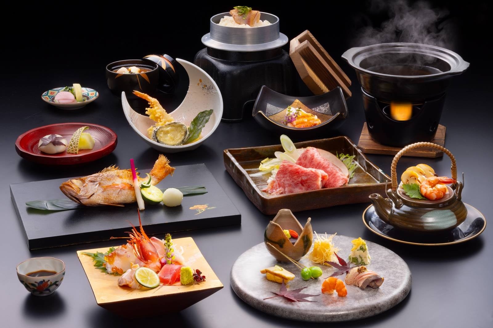 ノドグロや甘海老、ズワイ蟹、輪島ふぐ、寒ブリなど新鮮な海の幸、五郎島金時芋や金時草などの加賀野菜は、造里や郷土料理、揚げたて天婦羅など会席料理でお召し上がりいただけます。2022年4月からご夕食時は、ビールや地酒、焼酎、ワイン、ウイスキー、ソフトドリンクなどフリーフロー。