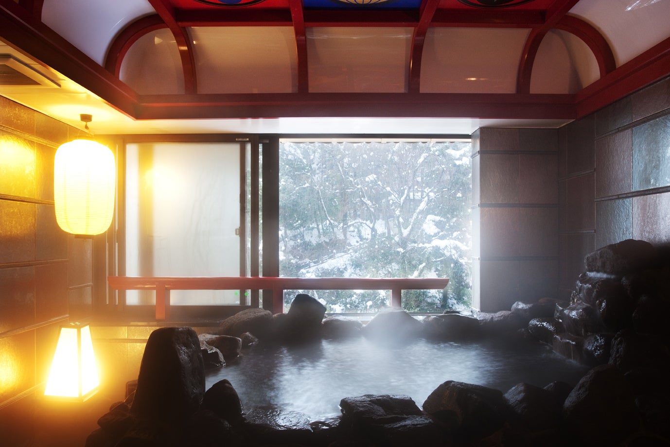 北陸随一の渓谷美“鶴仙渓”に手が届きそうな露天風呂で、芭蕉が愛したまろやかな湯に浸かり、くつろぎのひとときを。館内の貸切風呂や山中温泉の総湯も無料でお愉しみいただけます。