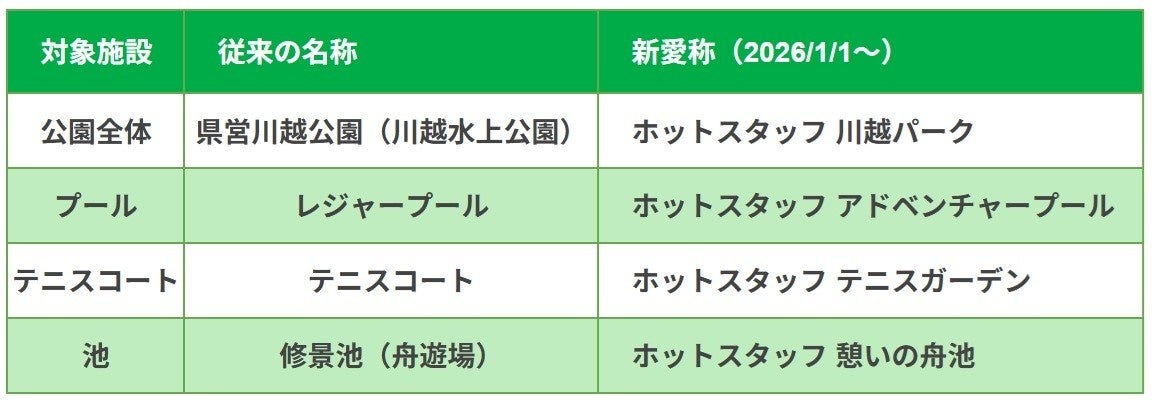 株式会社ホットスタッフ川越(本社:埼玉県川越市、代表取締役社長:仲津 誠)は、県営 川越公園(川越水上公園)」および園内3施設のネーミングライツを取得いたしました。