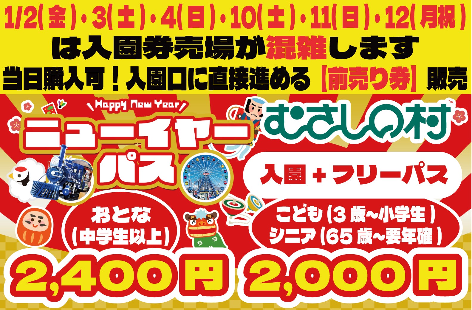 〈内容〉お正月限定特別割引販売!むさしの村からご来園のお客様へのお年玉イベント♪入園フリーパスが最大800円引きでとってもお得に楽しめちゃいます♪