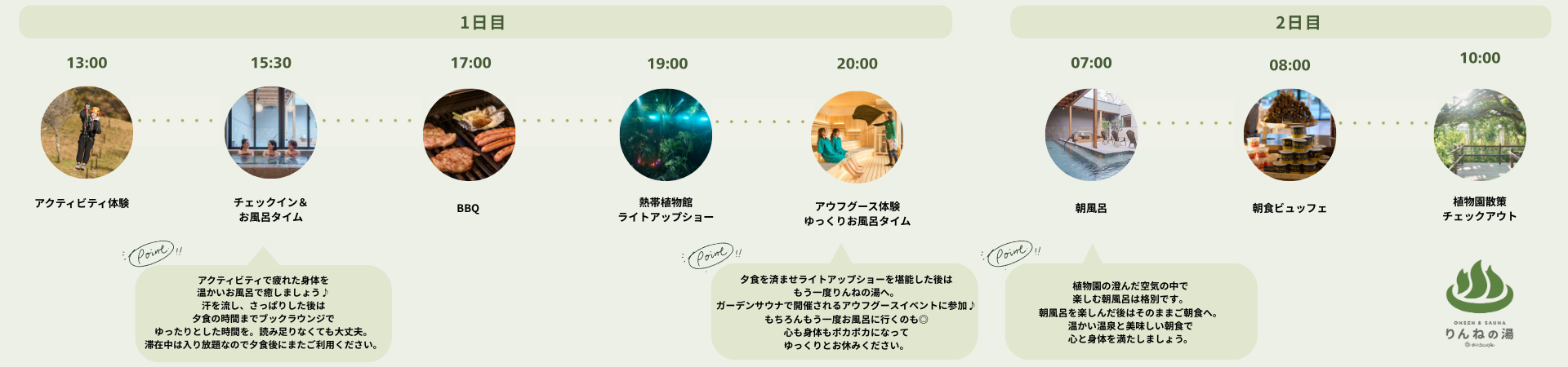 おふろcaféりんねの湯を中心に楽しむ、1泊2日のおすすめ滞在スケジュール例